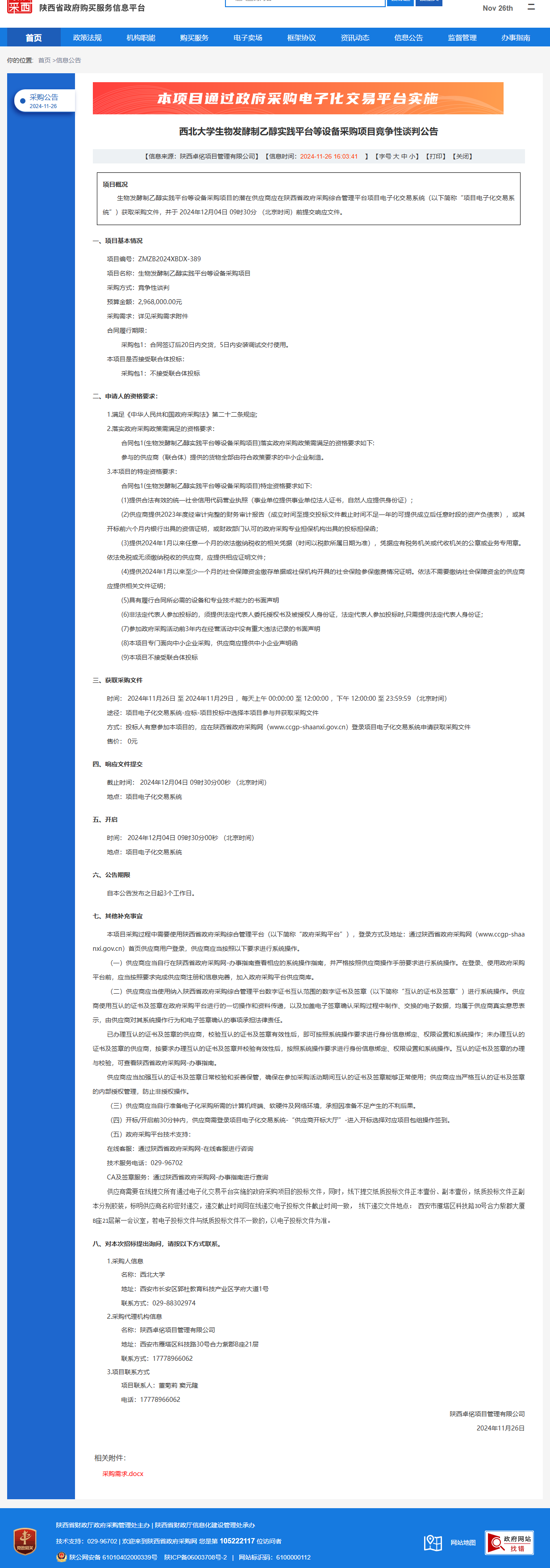 欧冠官方网站生物发酵制乙醇实践平台等设备采购项目竞争性谈判公告 作者:采购与招标办公室 编辑: 时间:2024-11-26 原公告链接:https://www.ccgp-shaanxi.gov.cn/freecms/site/shaanxi/ggxx/info/2024/8a69c95d921859f0019365f6c5e47f67.html?noticeType=001013¬iceId=8a2ac2c3-abce-11ef-8063-08c0eb20c666