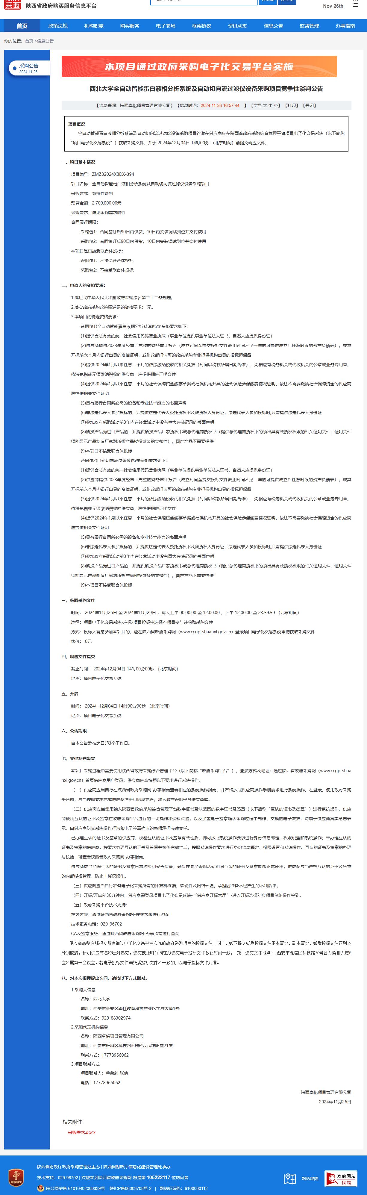 欧冠官方网站全自动智能蛋白液相分析系统及自动切向流过滤仪设备采购项目竞争性谈判公告 作者:采购与招标办公室 编辑: 时间:2024-11-26 原公告链接:https://www.ccgp-shaanxi.gov.cn/freecms/site/shaanxi/ggxx/info/2024/8a69c5a59218576d01936775f5d97931.html?noticeType=001013¬iceId=17632152-abd6-11ef-8063-08c0eb20c666