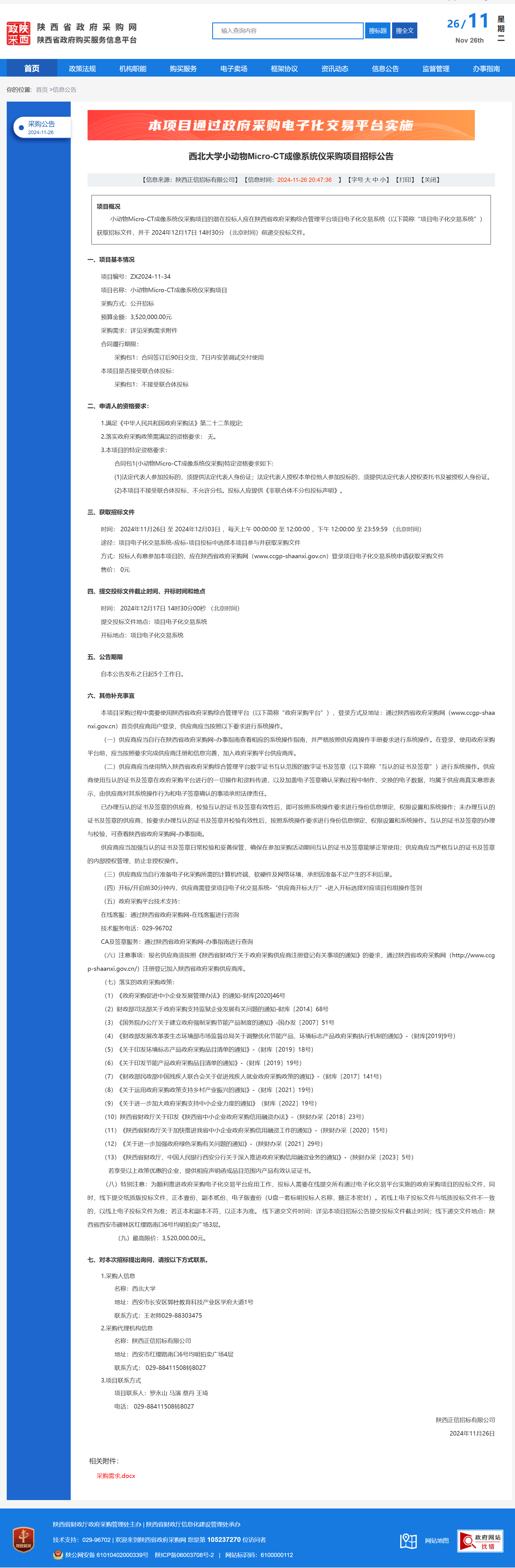 欧冠官方网站小动物Micro-CT成像系统仪采购项目招标公告 作者:采购与招标办公室 编辑: 时间:2024-11-26 原公告链接:https://www.ccgp-shaanxi.gov.cn/freecms/site/shaanxi/ggxx/info/2024/8a69c251921857370193685963892947.html?noticeType=001011¬iceId=3436110f-abf6-11ef-8063-08c0eb20c666