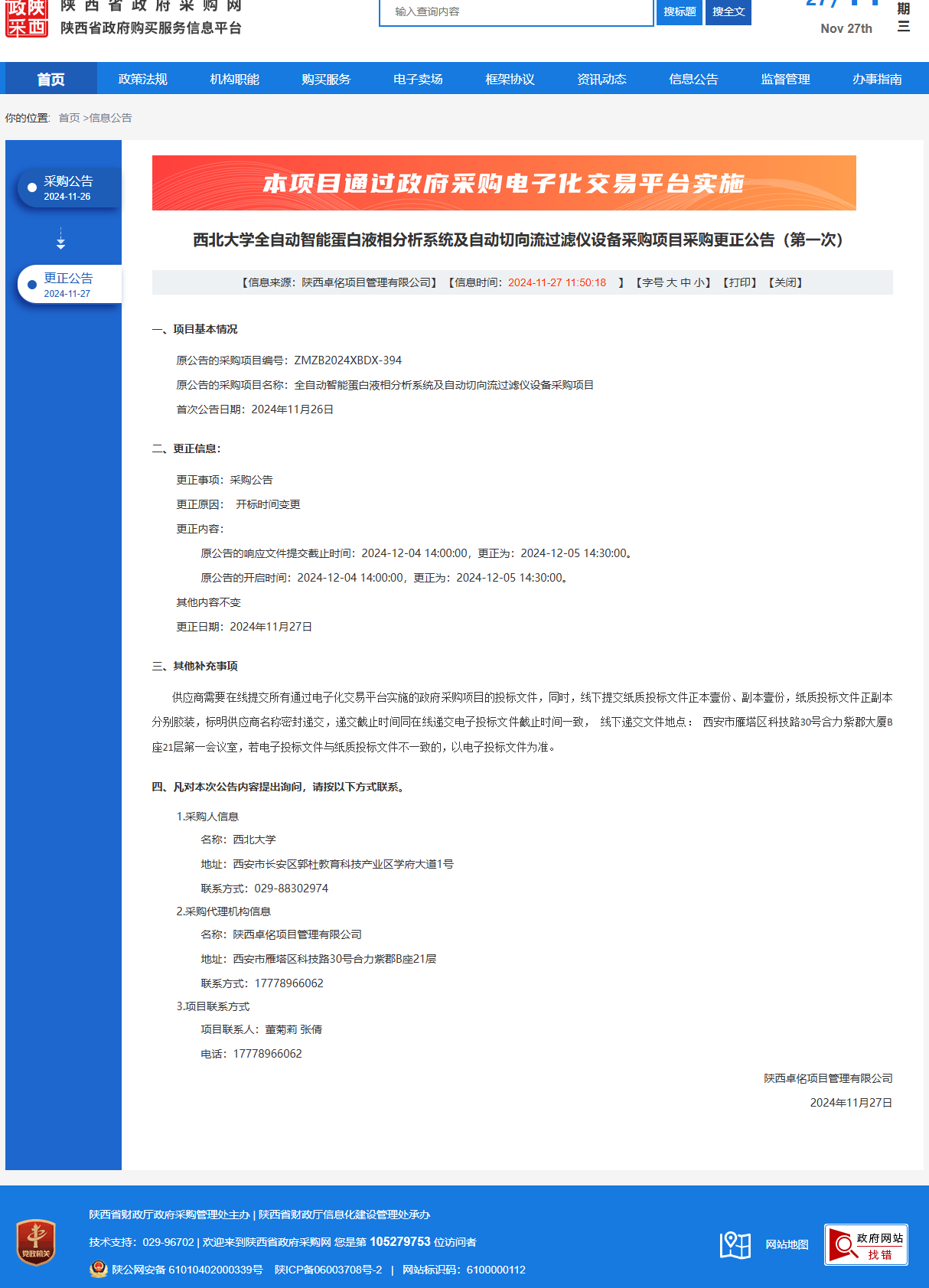 欧冠官方网站全自动智能蛋白液相分析系统及自动切向流过滤仪设备采购项目采购更正公告 作者:采购与招标办公室 编辑: 时间:2024-11-27 原公告链接:https://www.ccgp-shaanxi.gov.cn/freecms/site/shaanxi/ggxx/info/2024/8a69c44e9218572b01936bbab7481f2c.html?noticeType=001031¬iceId=4f3bb739-ac74-11ef-8063-08c0eb20c666