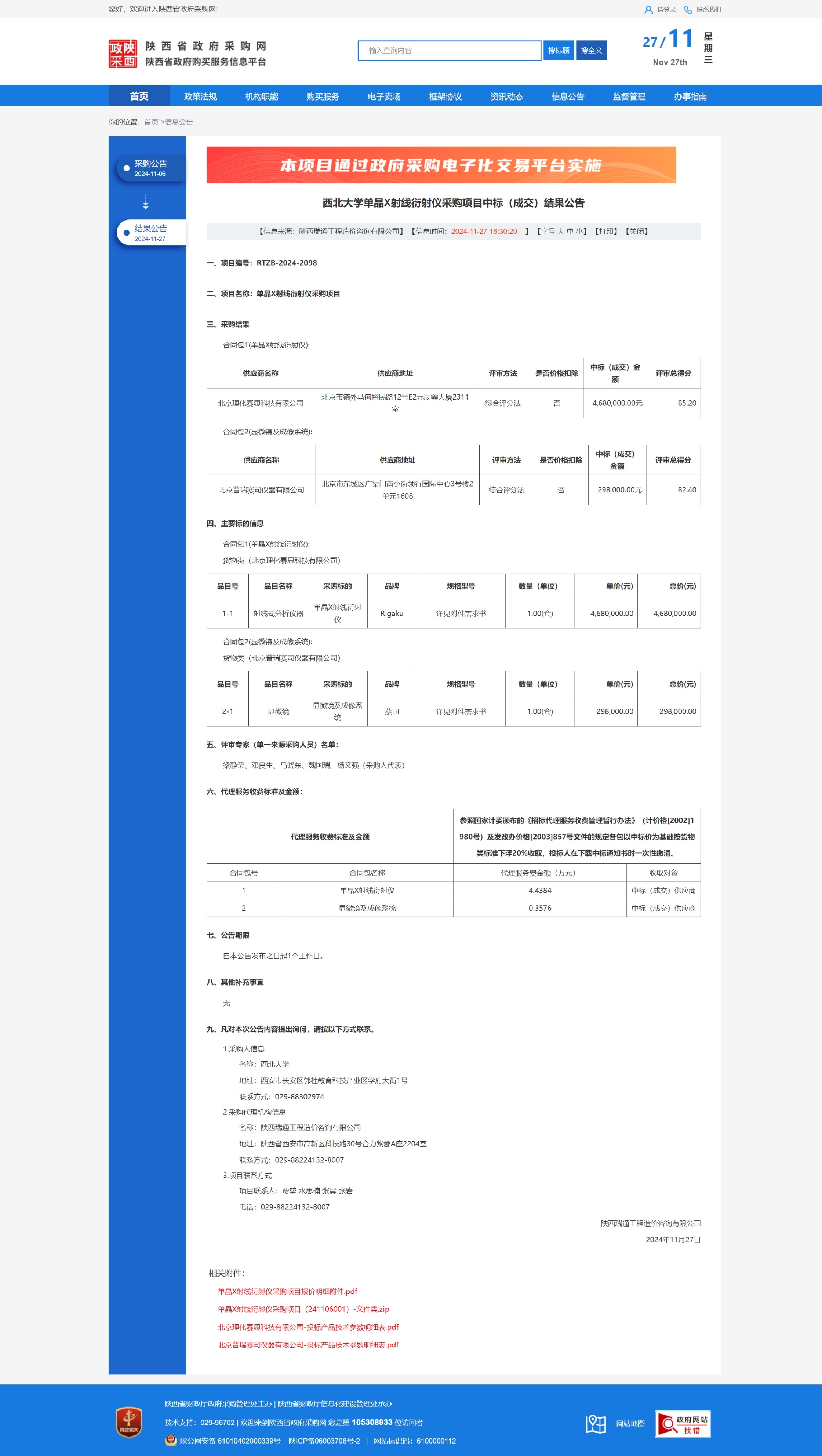 欧冠官方网站单晶X射线衍射仪采购项目中标(成交)结果公告 作者: 编辑:薛利娟 时间:2024-11-27 原公告链接:https://www.ccgp-shaanxi.gov.cn/freecms/site/shaanxi/ggxx/info/2024/8a69c2519218573701936c9dc8b83cb3.html?noticeType=001021¬iceId=6e7a9363-ac9b-11ef-8063-08c0eb20c666