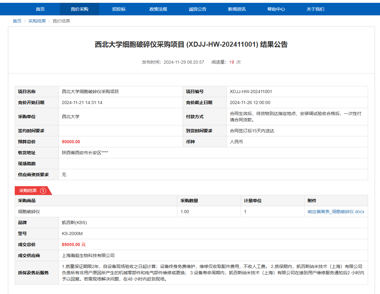 欧冠官方网站细胞破碎仪采购项目(XDJJ-HW-202411001)竞价结果公告 作者:采购与招标办公室 编辑: 时间:2024-11-29 原公告链接:https://www.ejingcai.com.cn/site/bidding/detail/15477