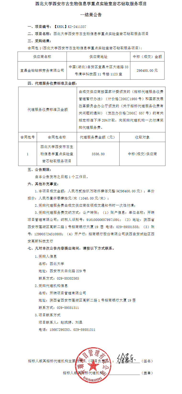 欧冠官方网站西安市古生物信息学重点实验室岩芯钻取服务项目结果公告
