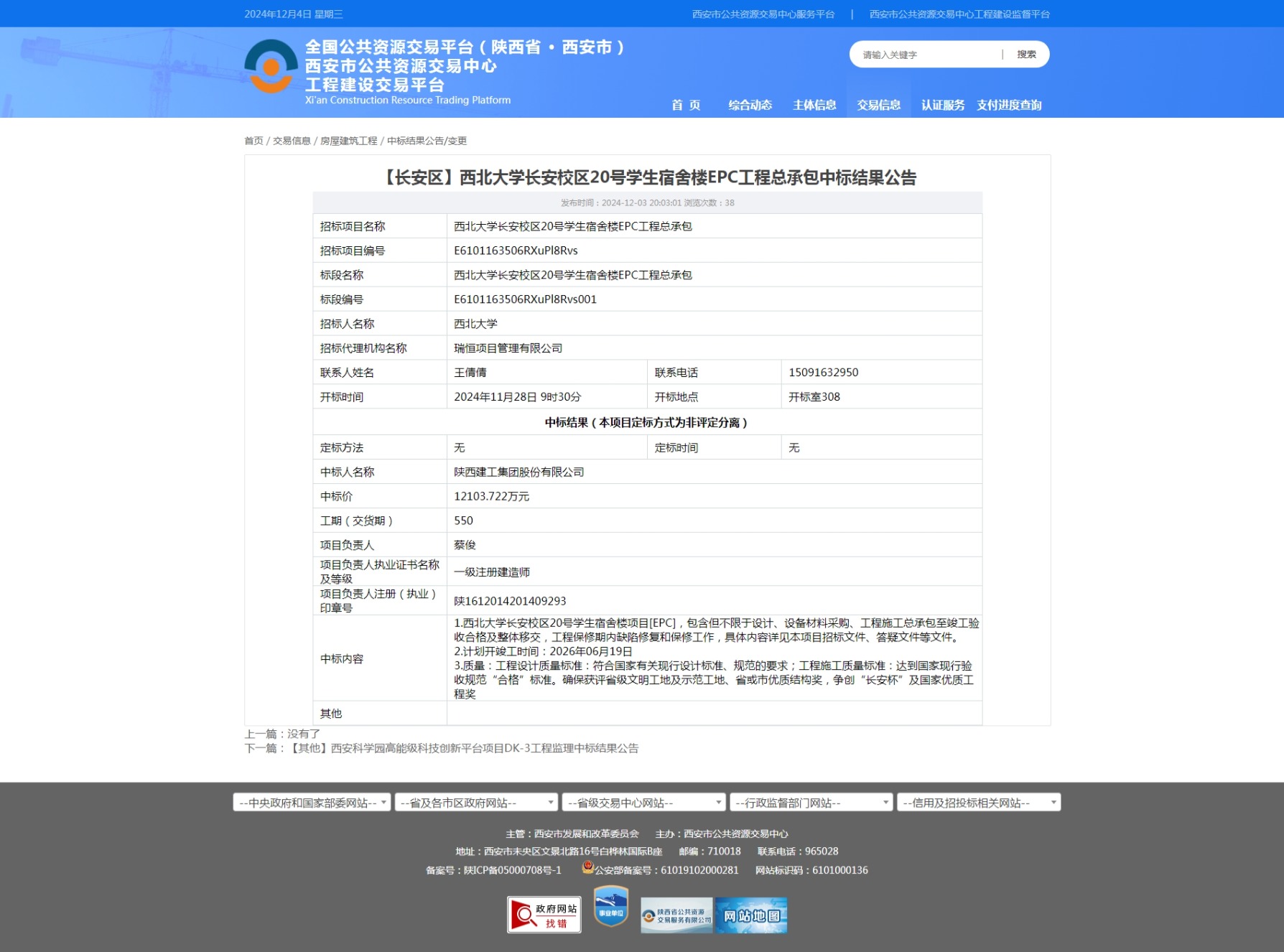 欧冠官方网站长安校区20号学生宿舍楼EPC工程总承包中标结果公告