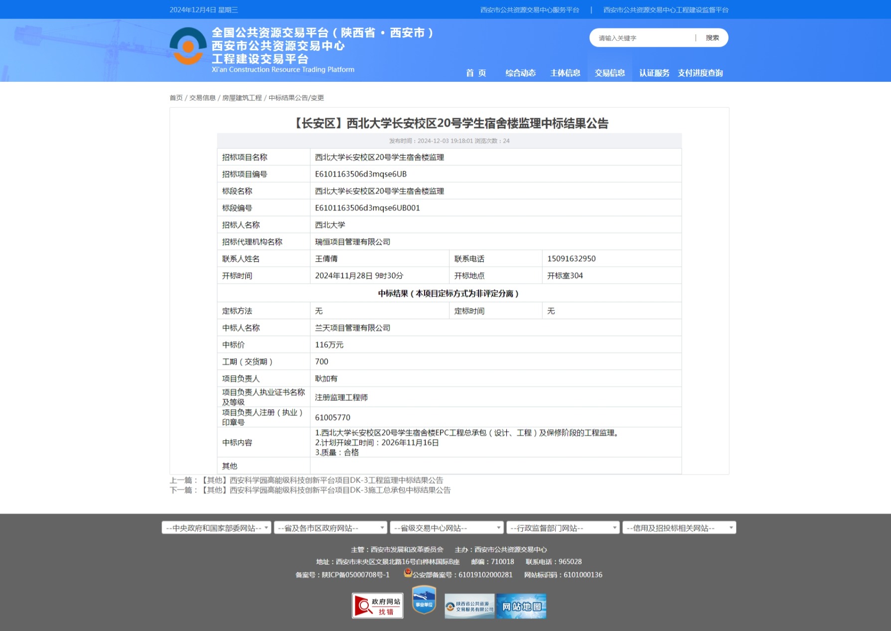 欧冠官方网站长安校区20号学生宿舍楼监理中标结果公告