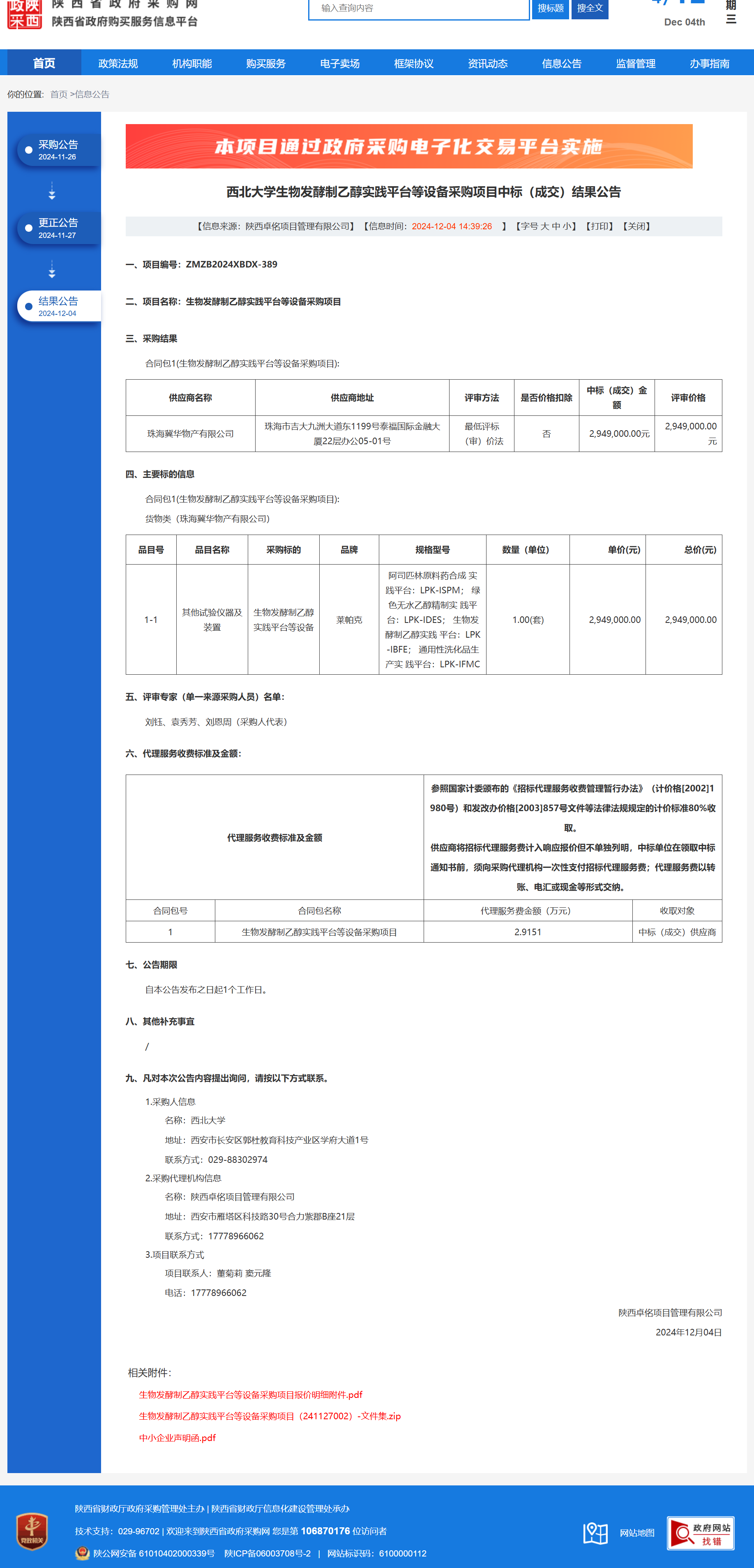 欧冠官方网站生物发酵制乙醇实践平台等设备采购项目中标(成交)结果公告 作者:采购与招标办公室 编辑: 时间:2024-12-04 原公告链接:https://www.ccgp-shaanxi.gov.cn/freecms/site/shaanxi/ggxx/info/2024/8a69c5a59218576d0193905cb113521a.html?noticeType=001023¬iceId=1cad3dce-b20c-11ef-8063-08c0eb20c666