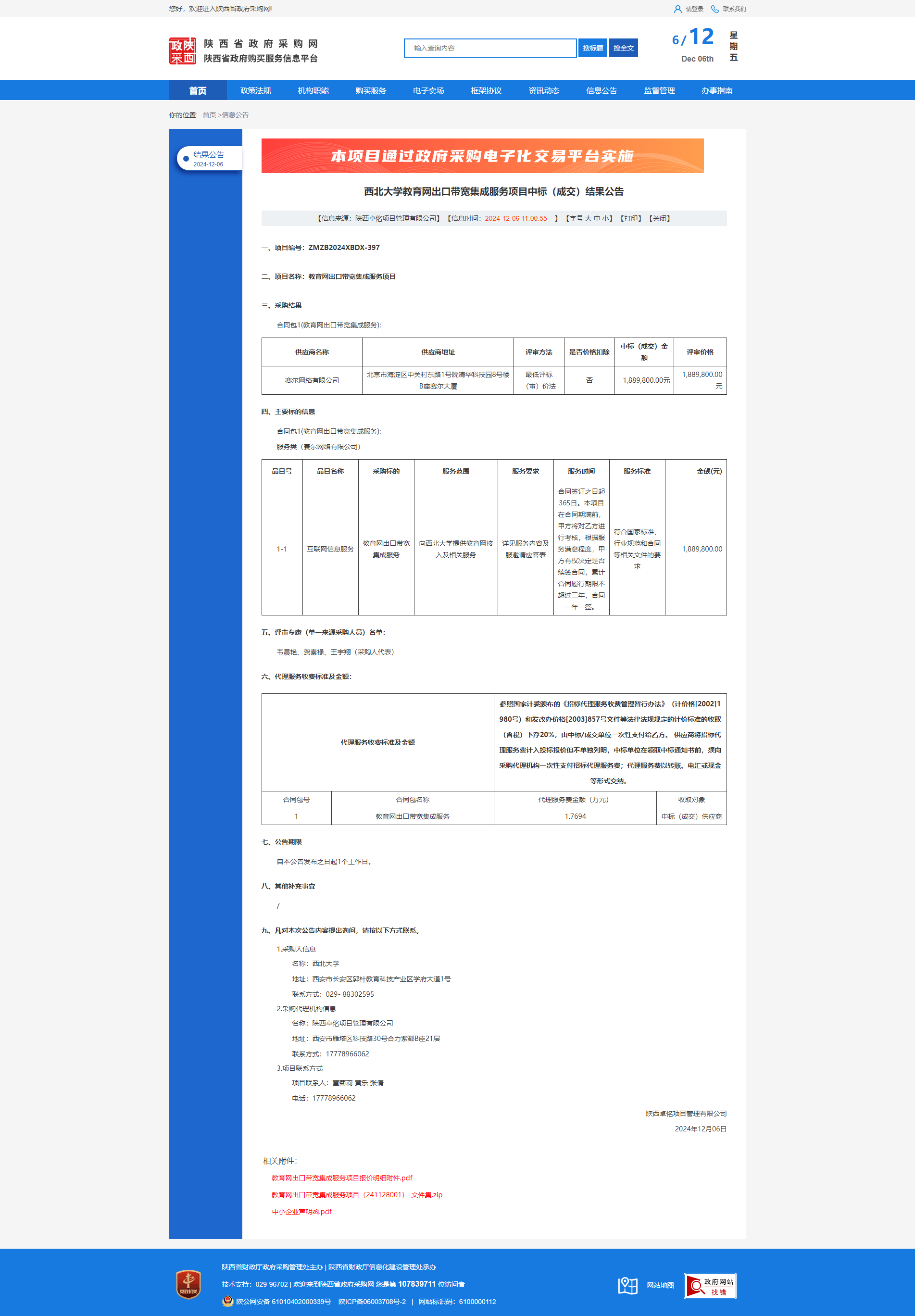 欧冠官方网站教育网出口带宽集成服务项目中标(成交)结果公告