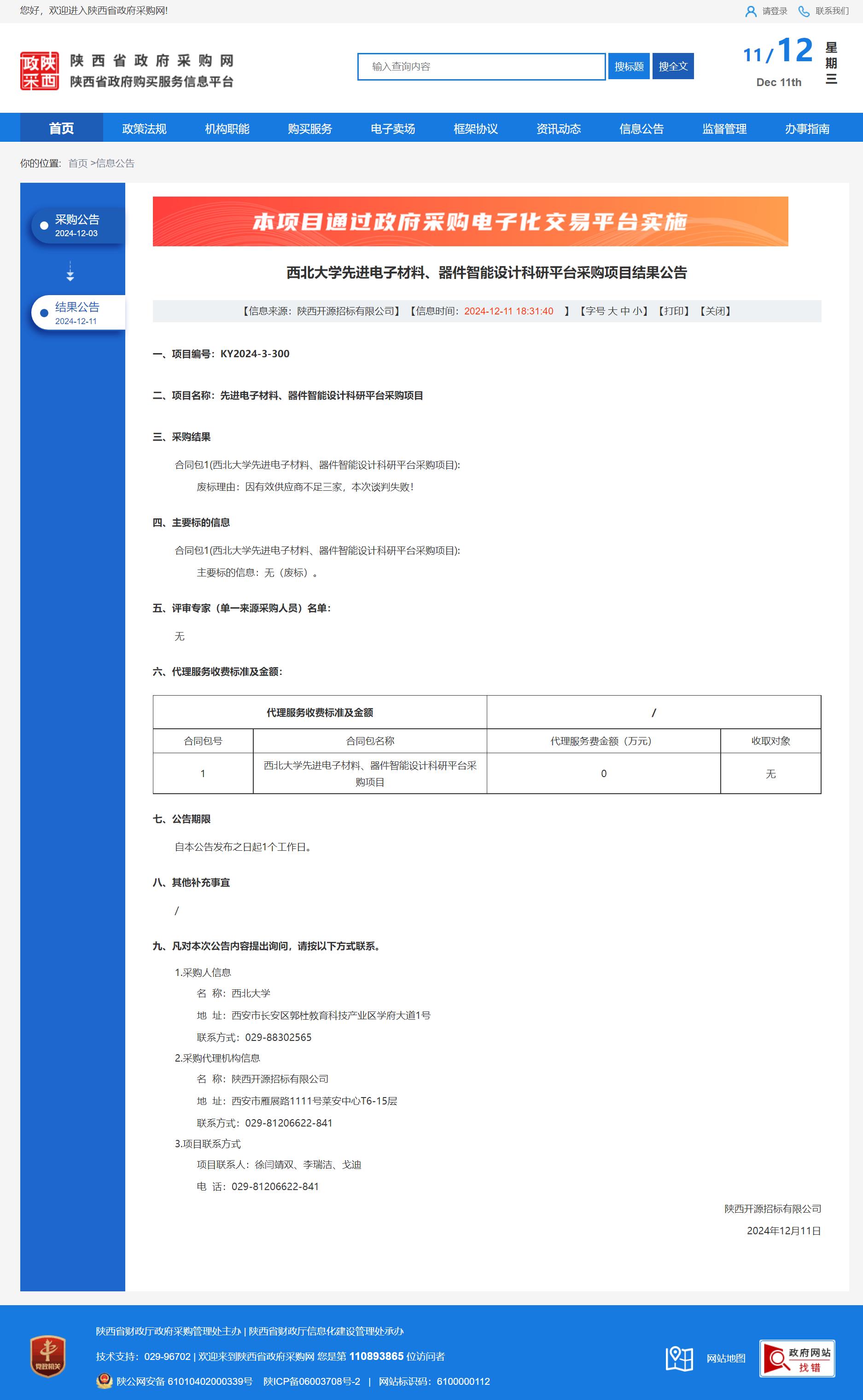 欧冠官方网站先进电子材料、器件智能设计科研平台采购项目结果公告