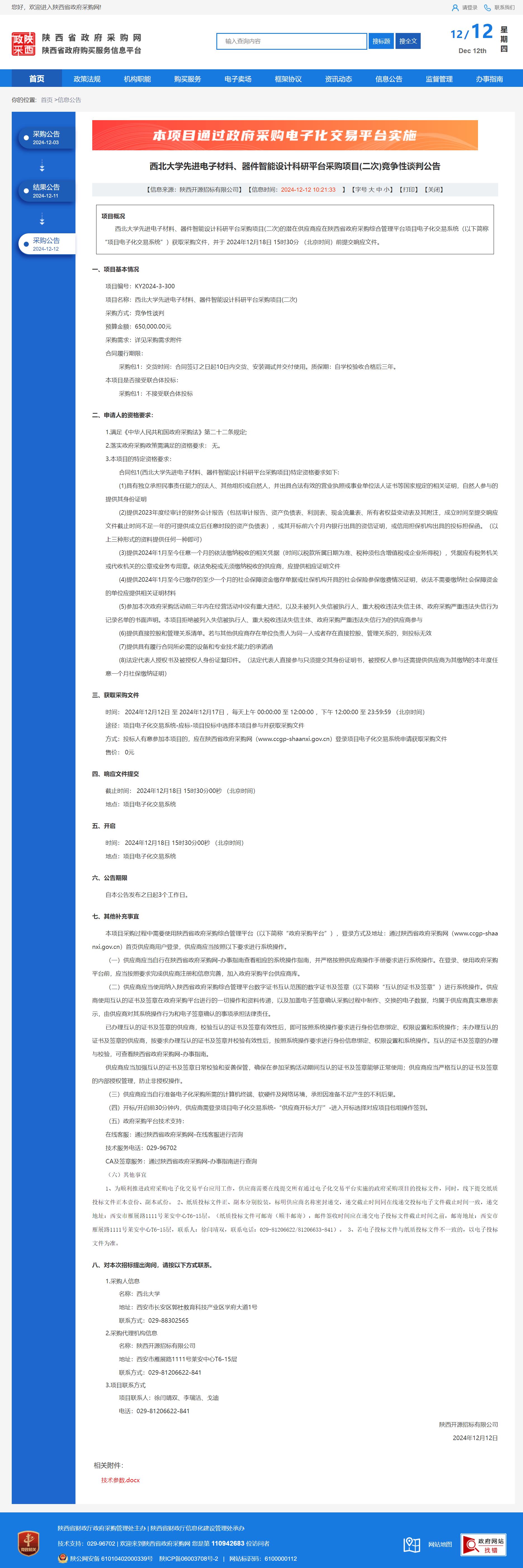 欧冠官方网站先进电子材料、器件智能设计科研平台采购项目(二次)竞争性谈判公告