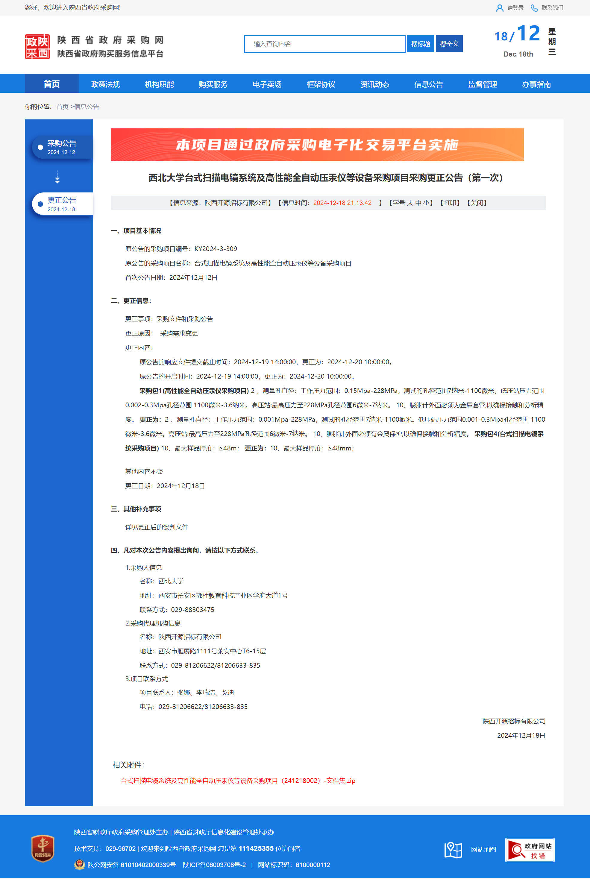 欧冠官方网站台式扫描电镜系统及高性能全自动压汞仪等设备采购项目采购更正公告(第一次)