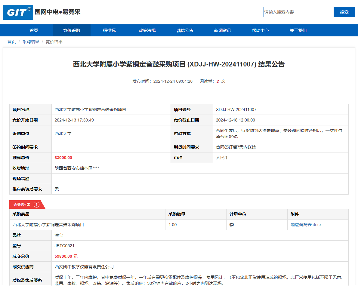 欧冠官方网站附属小学紫铜定音鼓采购项目(XDJJ-HW-202411007)竞价结果公告 作者:采购与招标办公室 编辑: 时间:2024-12-24 原公告链接:https://www.ejingcai.com.cn/site/bidding/detail/16145