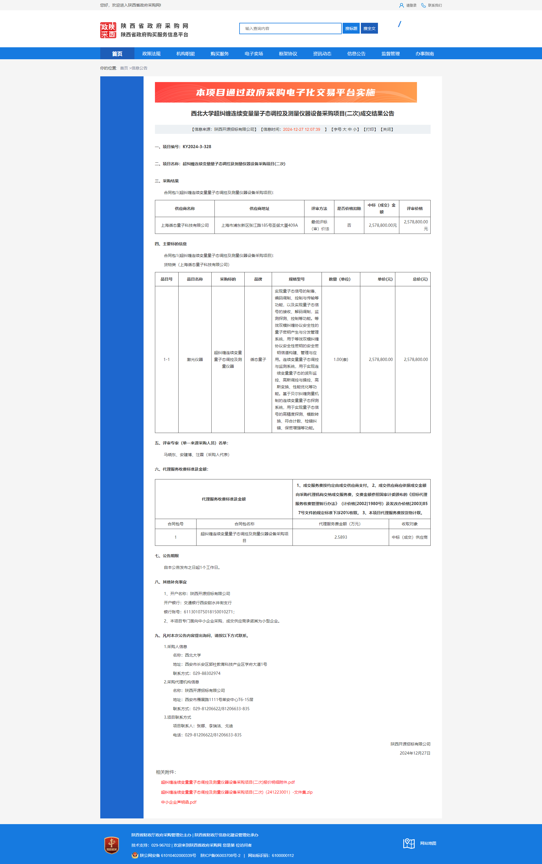 欧冠官方网站超纠缠连续变量量子态调控及测量仪器设备采购项目(二次)成交结果公告