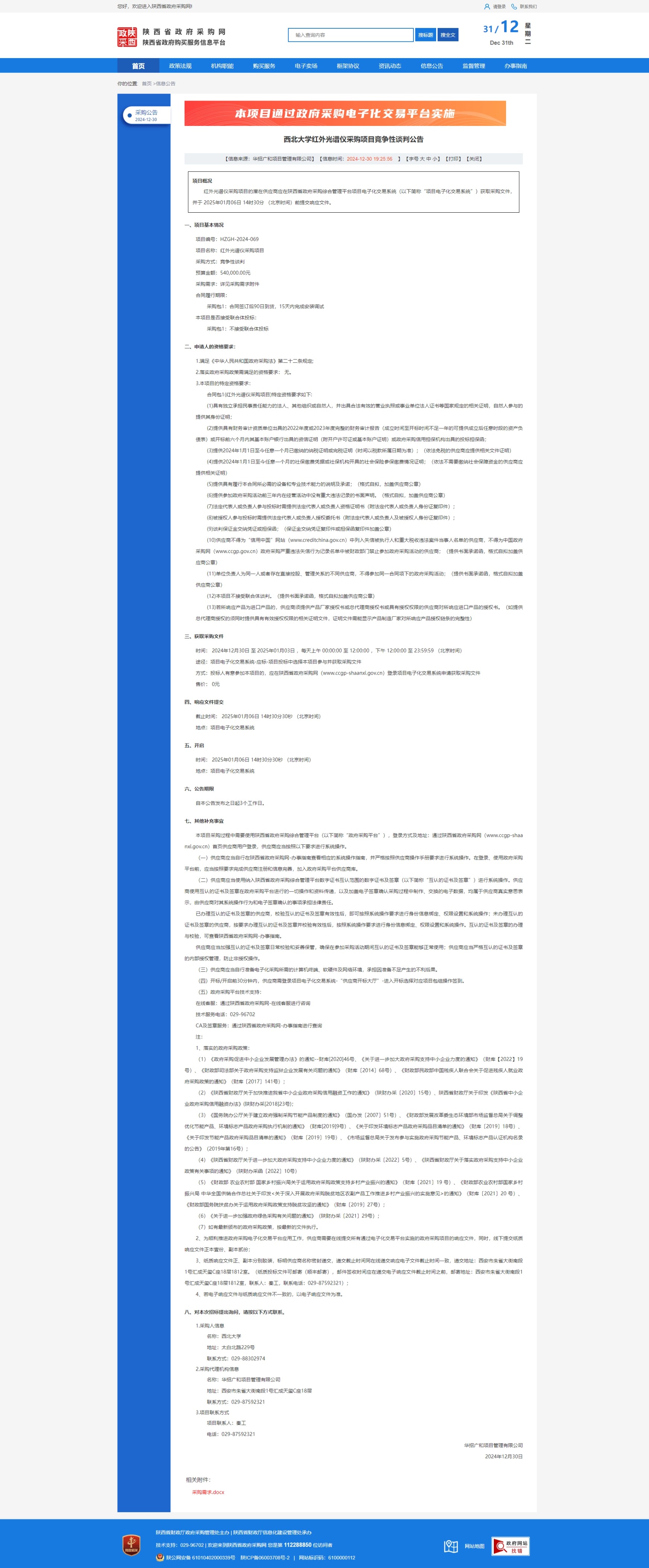 欧冠官方网站红外光谱仪采购项目竞争性谈判公告 作者: 编辑:薛利娟 时间:2024-12-31 原公告链接:https://www.ccgp-shaanxi.gov.cn/freecms/site/shaanxi/ggxx/info/2024/8a69c251921857370194174168cb49b9.html?noticeType=001013¬iceId=7e09294d-c6a2-11ef-8063-08c0eb20c666