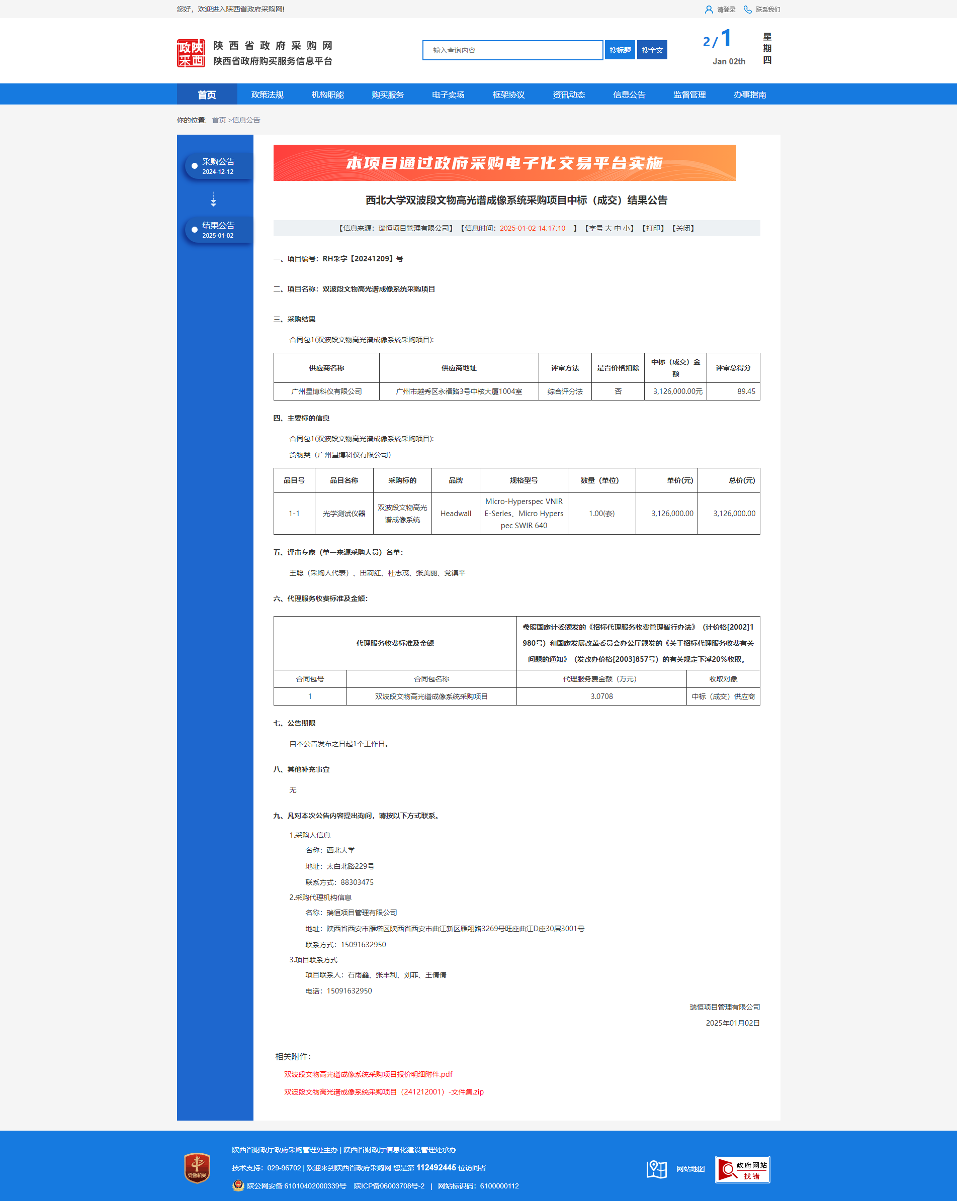 欧冠官方网站双波段文物高光谱成像系统采购项目中标(成交)结果公告