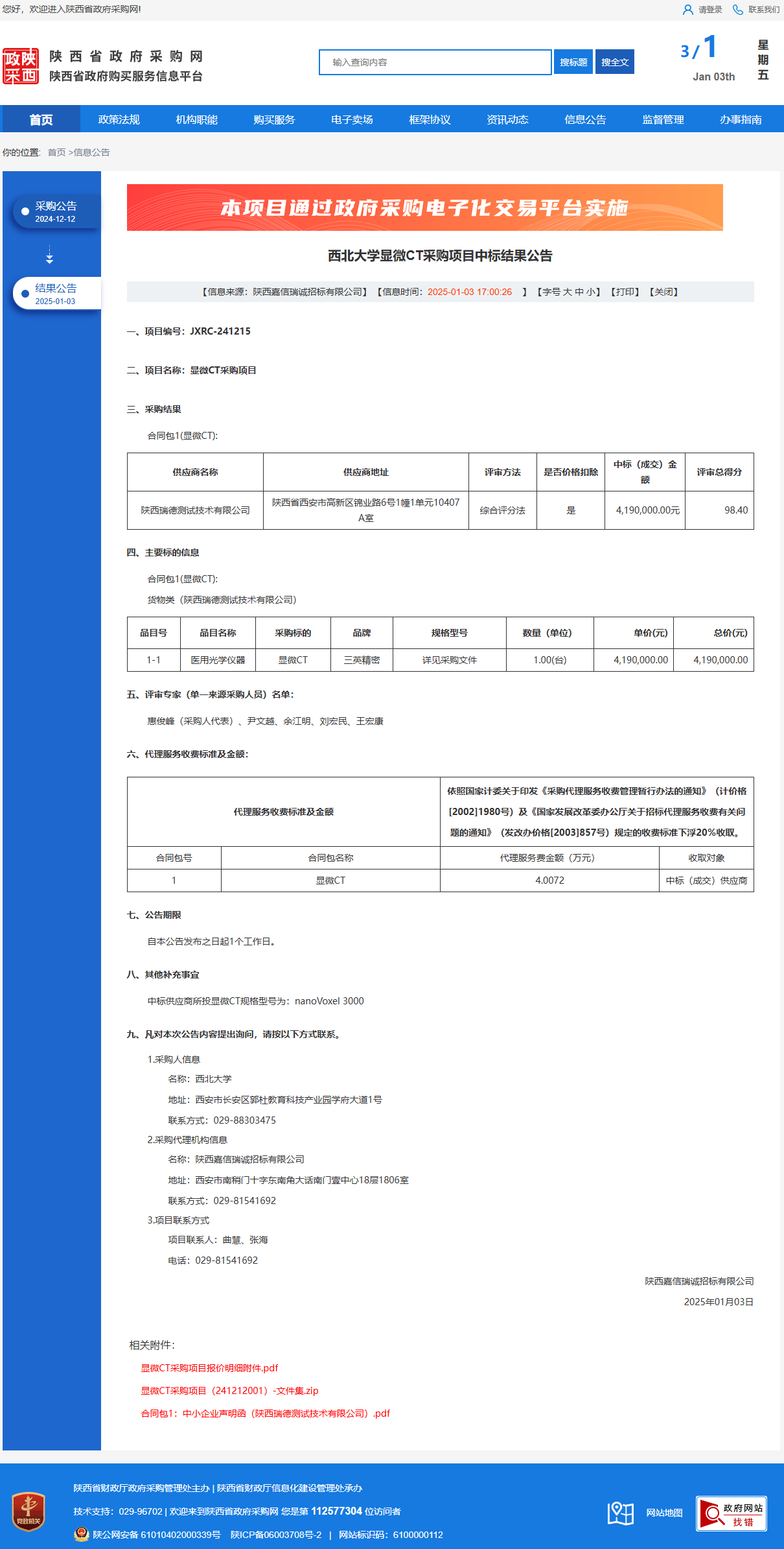 欧冠官方网站显微CT采购项目中标结果公告 作者:采购与招标办公室 编辑: 时间:2025-01-03 原公告链接:https://www.ccgp-shaanxi.gov.cn/freecms/site/shaanxi/ggxx/info/2025/8a69c44e9218572b01942b1fbacb63ce.html?noticeType=001021¬iceId=d5b3fb7e-c9b2-11ef-8063-08c0eb20c666