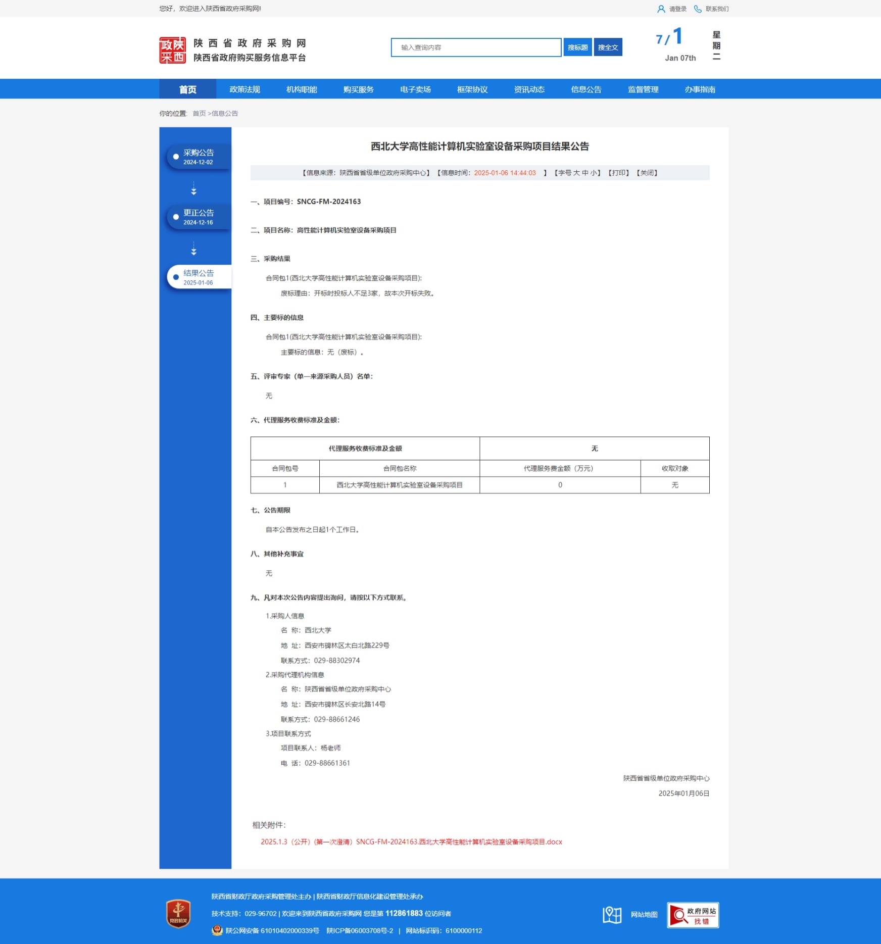 欧冠官方网站高性能计算机实验室设备采购项目结果公告 作者: 编辑:薛利娟 时间:2025-01-07 原公告链接:https://www.ccgp-shaanxi.gov.cn/freecms/site/shaanxi/ggxx/info/2025/8a69c95d921859f001943992fed82bb1.html?noticeType=001006¬iceId=49269ef4-cbfb-11ef-8063-08c0eb20c666