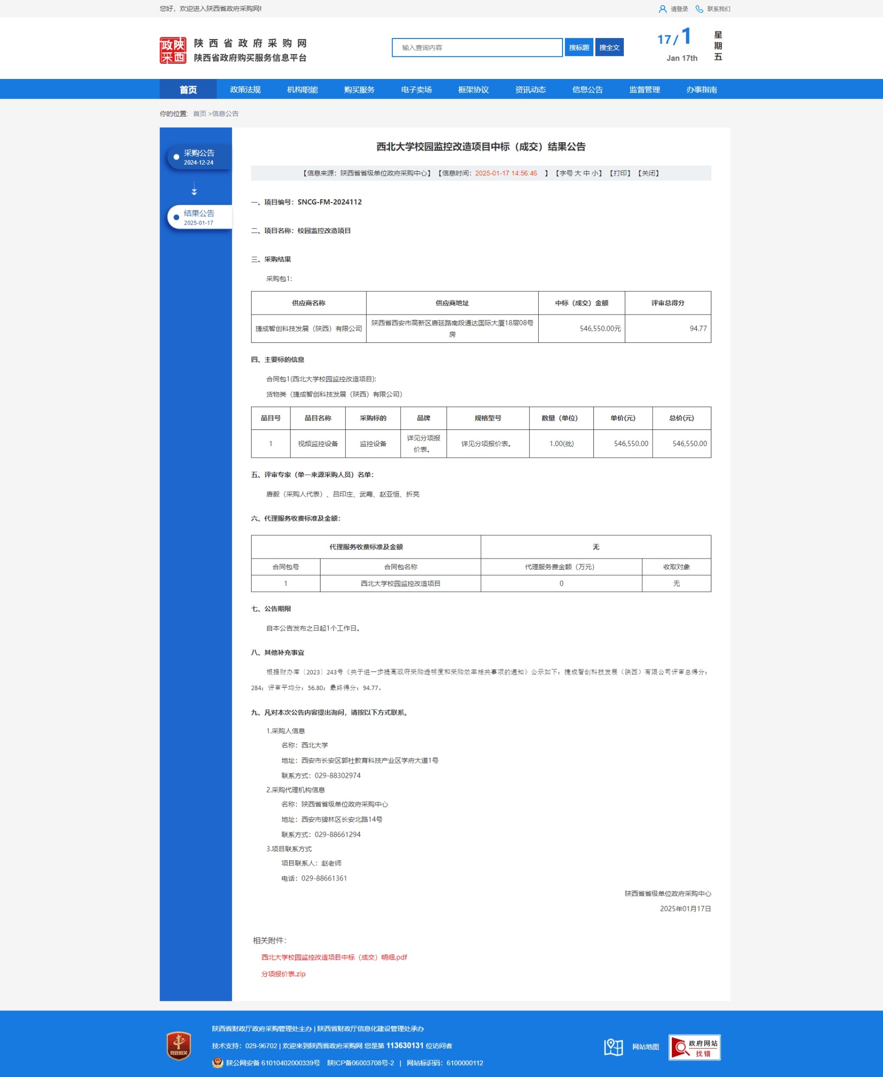 欧冠官方网站校园监控改造项目中标(成交)结果公告 作者: 编辑:薛利娟 时间:2025-01-17 原公告链接:https://www.ccgp-shaanxi.gov.cn/freecms/site/shaanxi/ggxx/info/2025/8a69c46994554cc2019471c2fbea2f8d.html?noticeType=001021¬iceId=e7f16300-d4a1-11ef-8063-08c0eb20c666