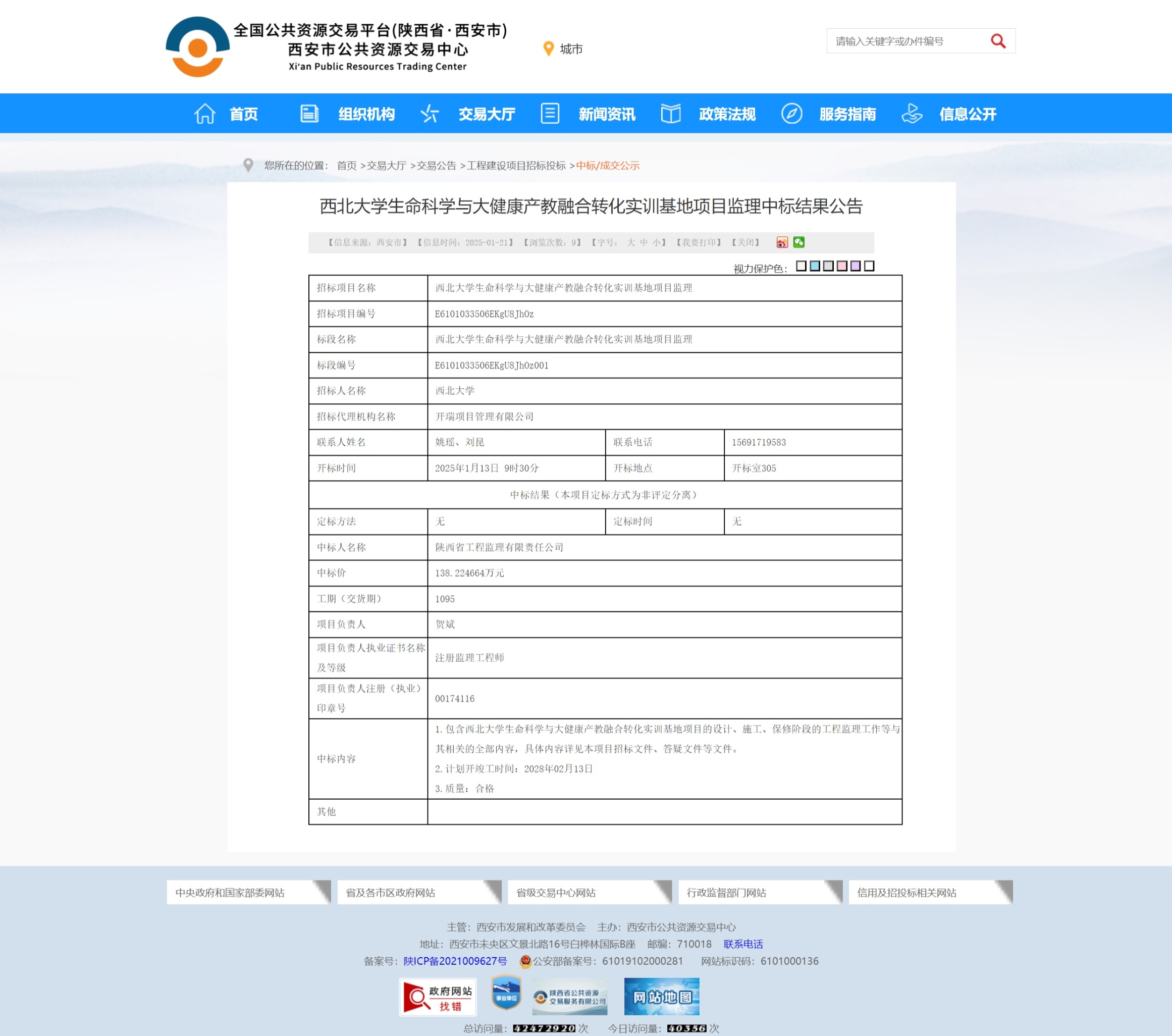 欧冠官方网站生命科学与大健康产教融合转化实训基地项目监理中标结果公告