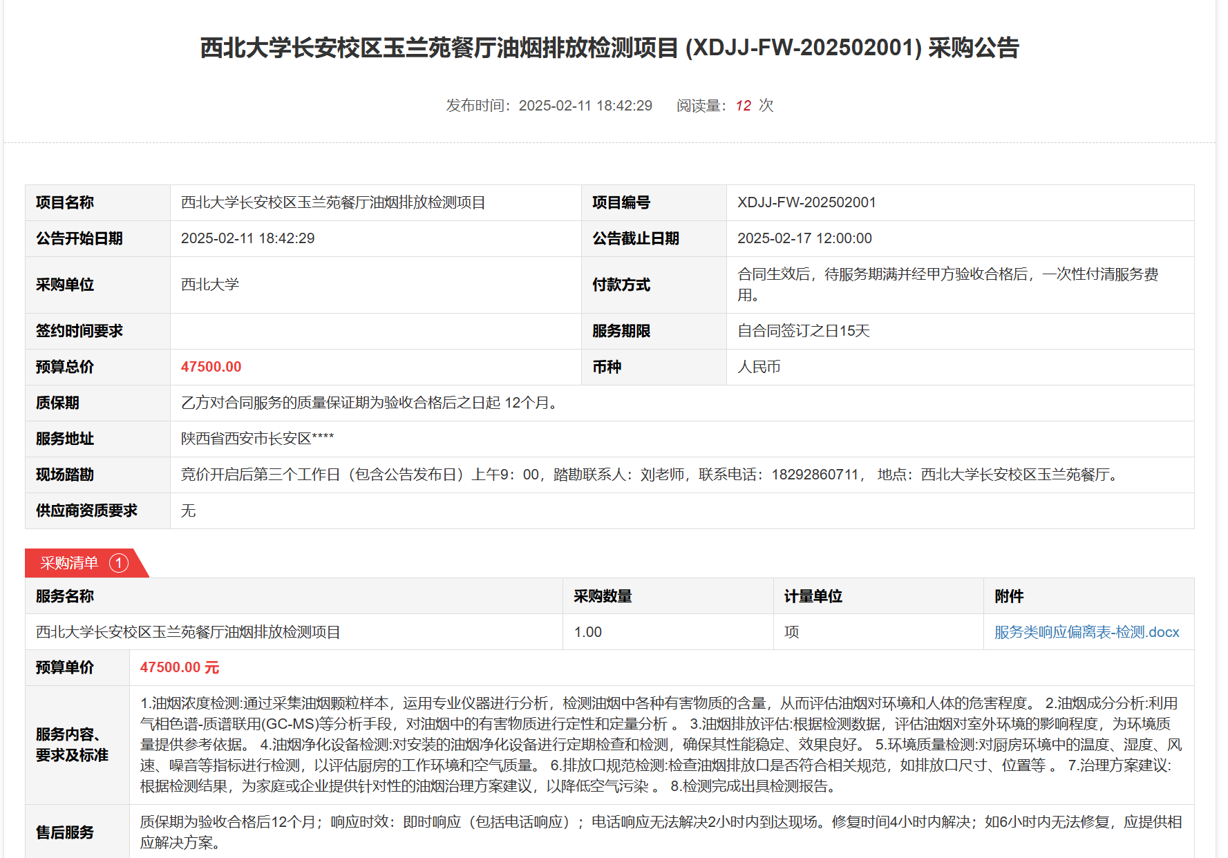 欧冠官方网站长安校区玉兰苑餐厅油烟排放检测项目(XDJJ-FW-202502001)竞价采购公告 作者:采购与招标办公室 编辑: 时间:2025-02-11 原公告链接:https://www.ejingcai.com.cn/site/bidding/detail/16498