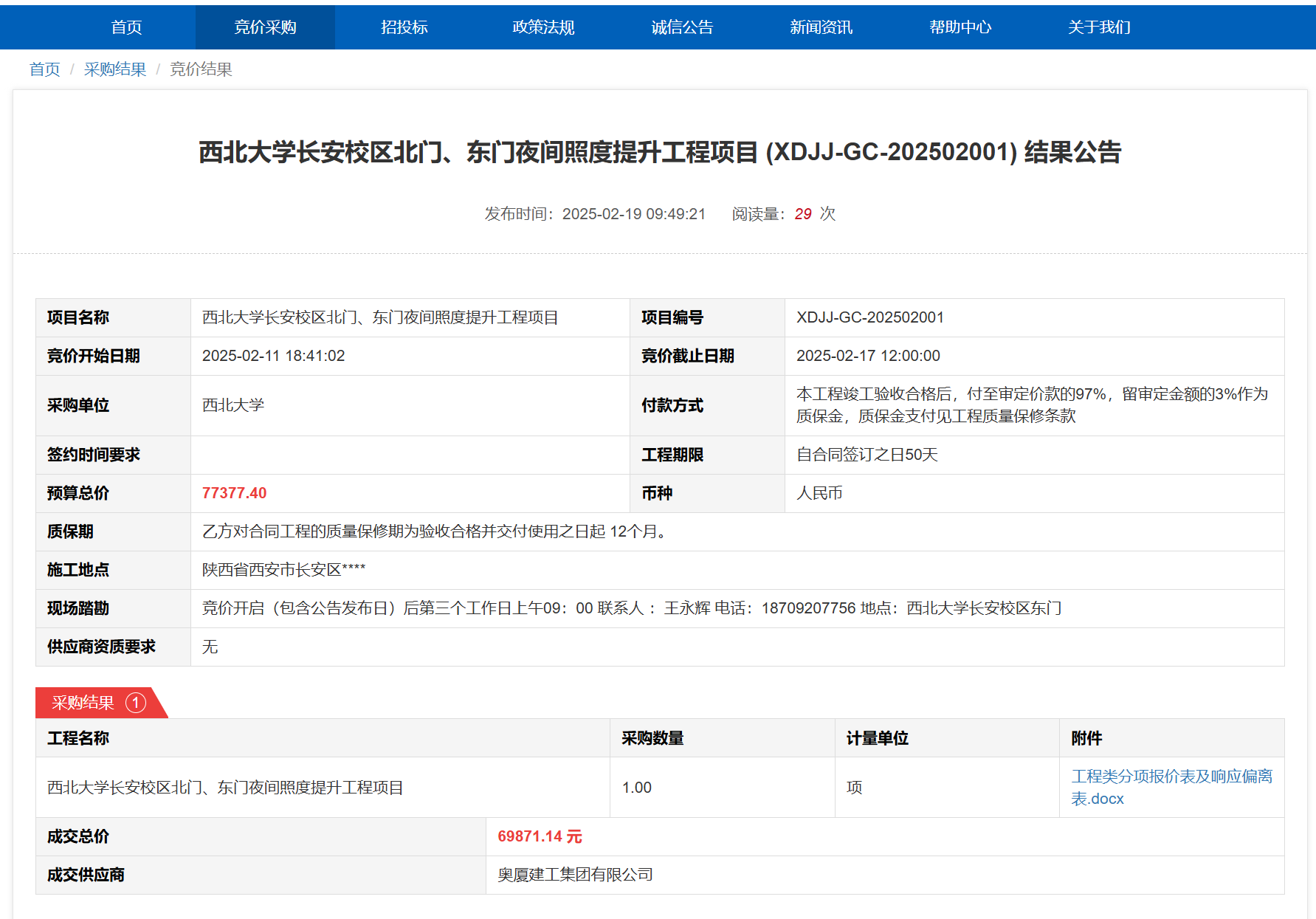 欧冠官方网站长安校区北门、东门夜间照度提升工程项目(XDJJ-GC-202502001)竞价结果公告 作者:采购与招标办公室 编辑: 时间:2025-02-19 原公告链接:https://www.ejingcai.com.cn/site/bidding/detail/16553