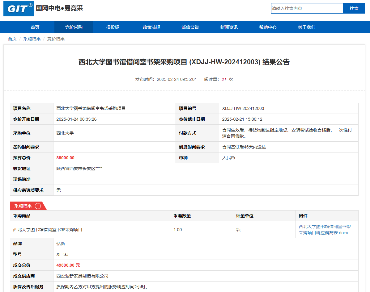 欧冠官方网站图书馆借阅室书架采购项目(XDJJ-HW-202412003)竞价结果公告 作者:采购与招标办公室 编辑: 时间:2025-02-24 原公告链接:https://www.ejingcai.com.cn/site/bidding/detail/16596