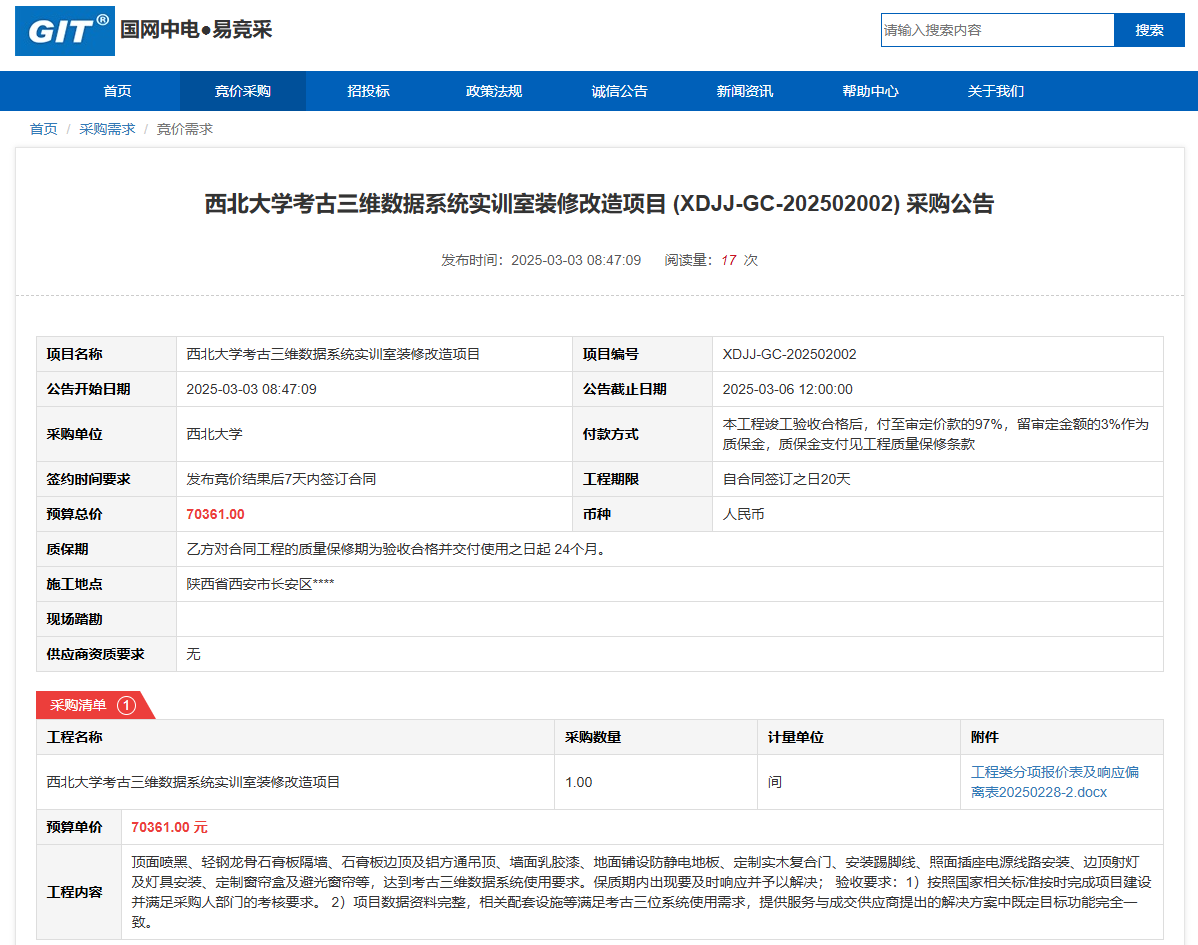 欧冠官方网站考古三维数据系统实训室装修改造项目(XDJJ-GC-202502002)竞价采购公告 作者:采购与招标办公室 编辑: 时间:2025-03-03 原公告链接:https://www.ejingcai.com.cn/site/bidding/detail/16671