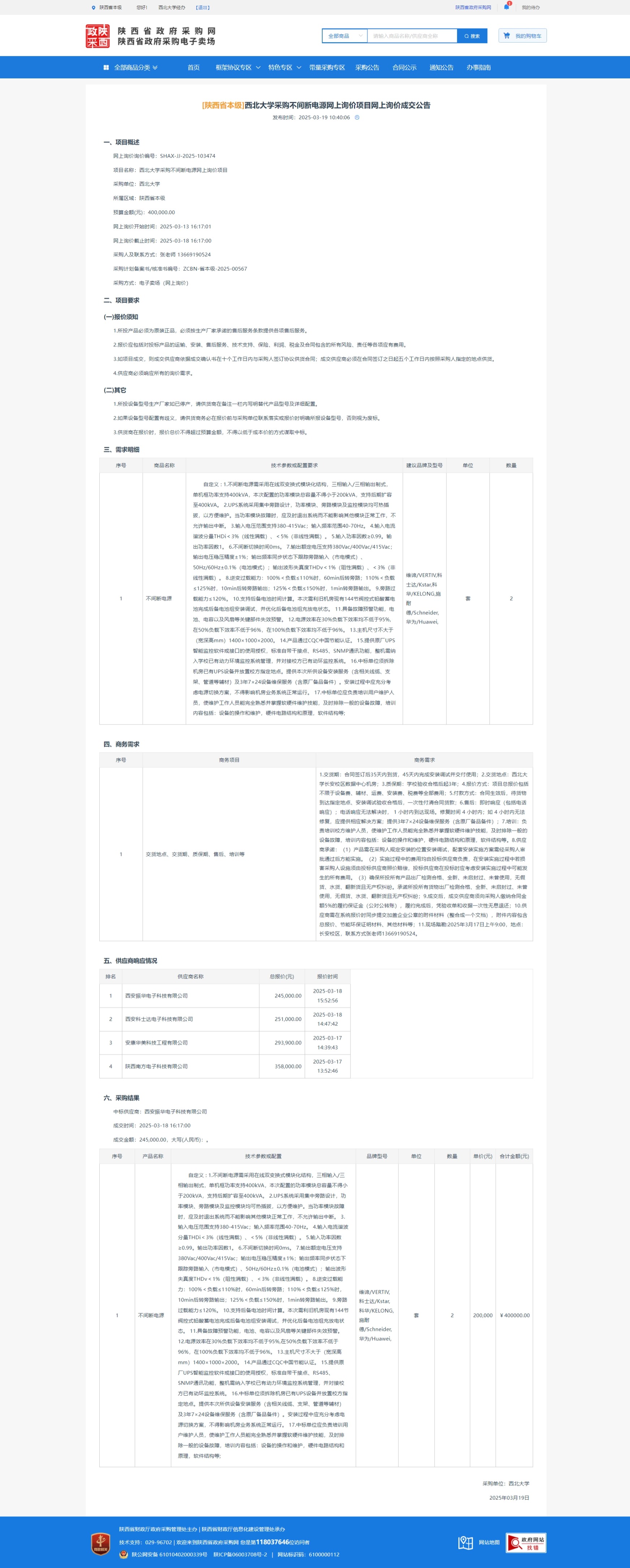 欧冠官方网站采购不间断电源网上询价项目网上询价成交公告 作者: 编辑:采购与招标办公室 时间:2025-03-19 原公告链接:https://www.ccgp-shaanxi.gov.cn/gpmall-main-web/basic/noticeDetail?noticeGuid=7301336059869331456