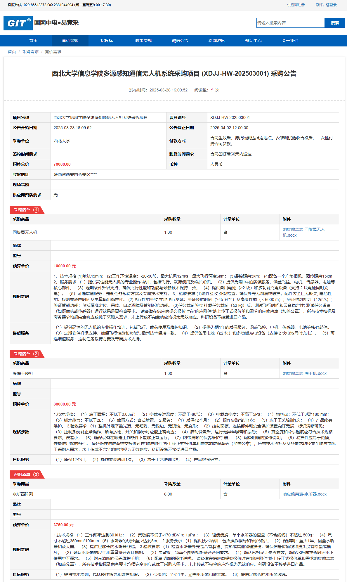 欧冠官方网站信息学院多源感知通信无人机系统采购项目(XDJJ-HW-202503001)竞价采购公告 作者:采购与招标办公室 编辑: 时间:2025-03-28 原公告链接:https://www.ejingcai.com.cn/site/bidding/detail/17255