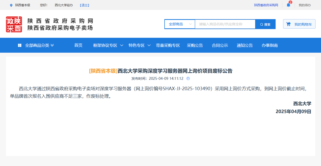 欧冠官方网站采购深度学习服务器网上询价项目废标公告 作者:采购与招标办公室 编辑: 时间:2025-04-09 原公告链接:https://www.ccgp-shaanxi.gov.cn/gpmall-main-web/basic/noticeDetail?noticeGuid=7308999329707130880