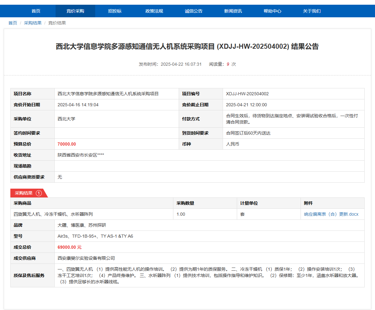欧冠官方网站信息学院多源感知通信无人机系统采购项目 (XDJJ-HW-202504002) 结果公告 作者:采购与招标办公室 编辑: 时间:2025-04-22 原公告链接:https://www.ejingcai.com.cn/site/bidding/detail/17844