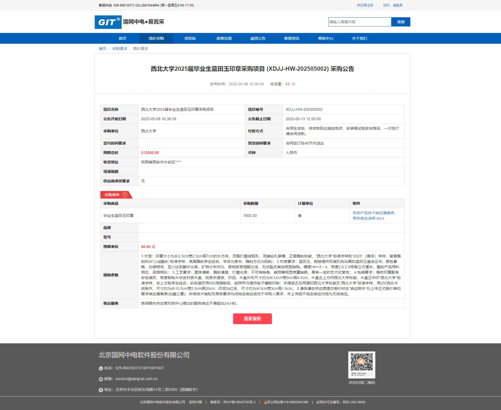 欧冠官方网站2025届毕业生蓝田玉印章采购项目 (XDJJ-HW-202505002) 竞价采购公告 作者: 编辑:采购与招标办公室 时间:2025-05-09 原公告链接:https://www.ejingcai.com.cn/site/bidding/detail/18114
