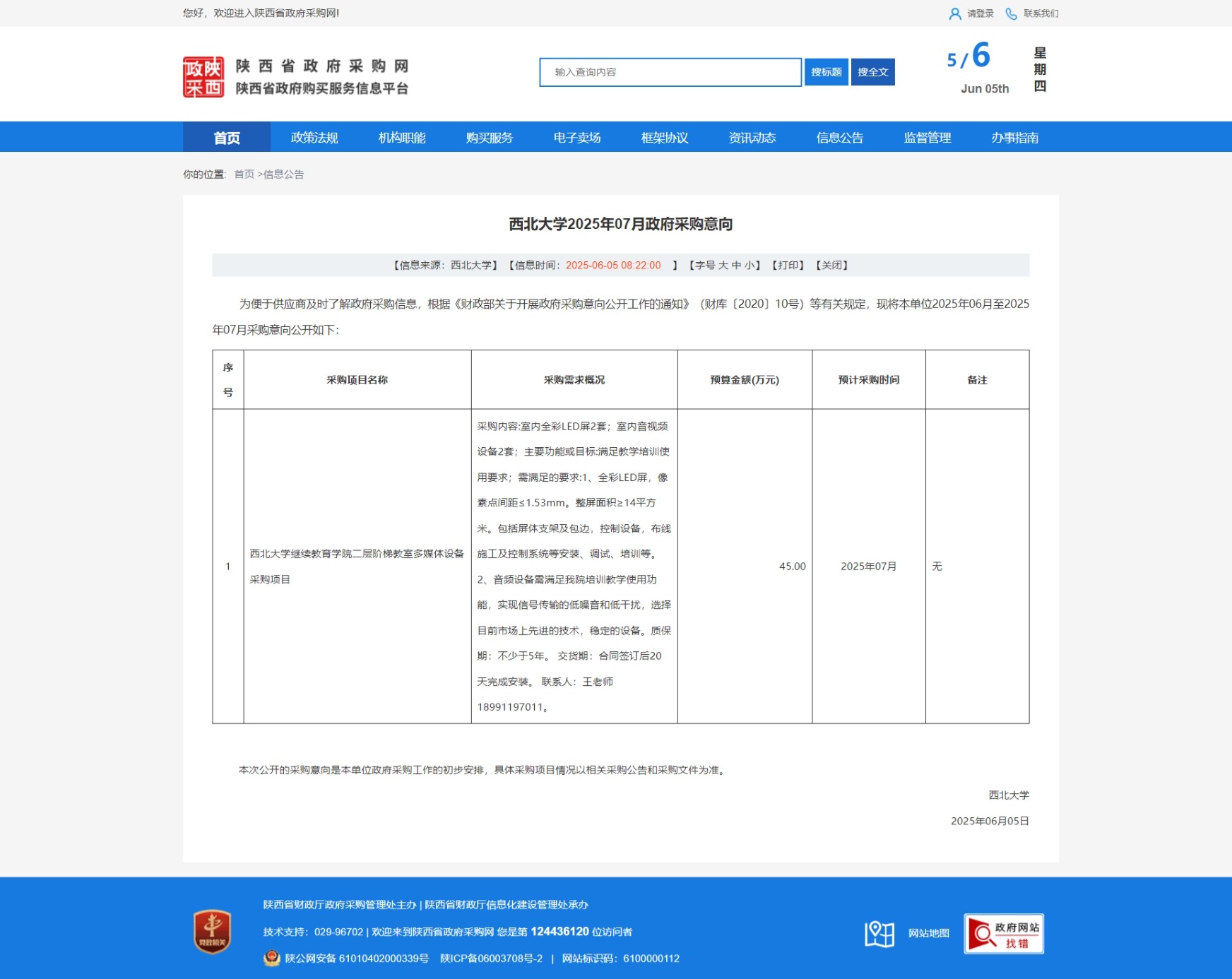 欧冠官方网站2025年07月政府采购意向 作者: 编辑:采购与招标办公室 时间:2025-06-05 原公告链接:https://www.ccgp-shaanxi.gov.cn/freecms/site/shaanxi/ggxx/info/2025/8a69c8d196ce440a01973d667fcf58b5.html?noticeType=59¬iceId=0a572344-41a5-11f0-8063-08c0eb20c666