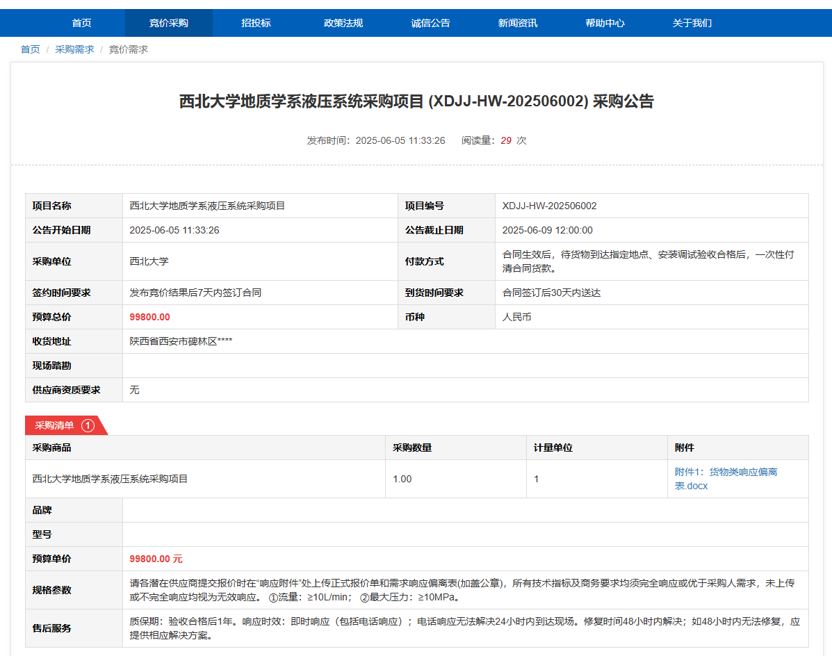 欧冠官方网站地质学系液压系统采购项目(XDJJ-HW-202506002)竞价采购公告 作者: 编辑: 时间:2025-06-05 原公告链接:https://www.ejingcai.com.cn/site/bidding/detail/18680