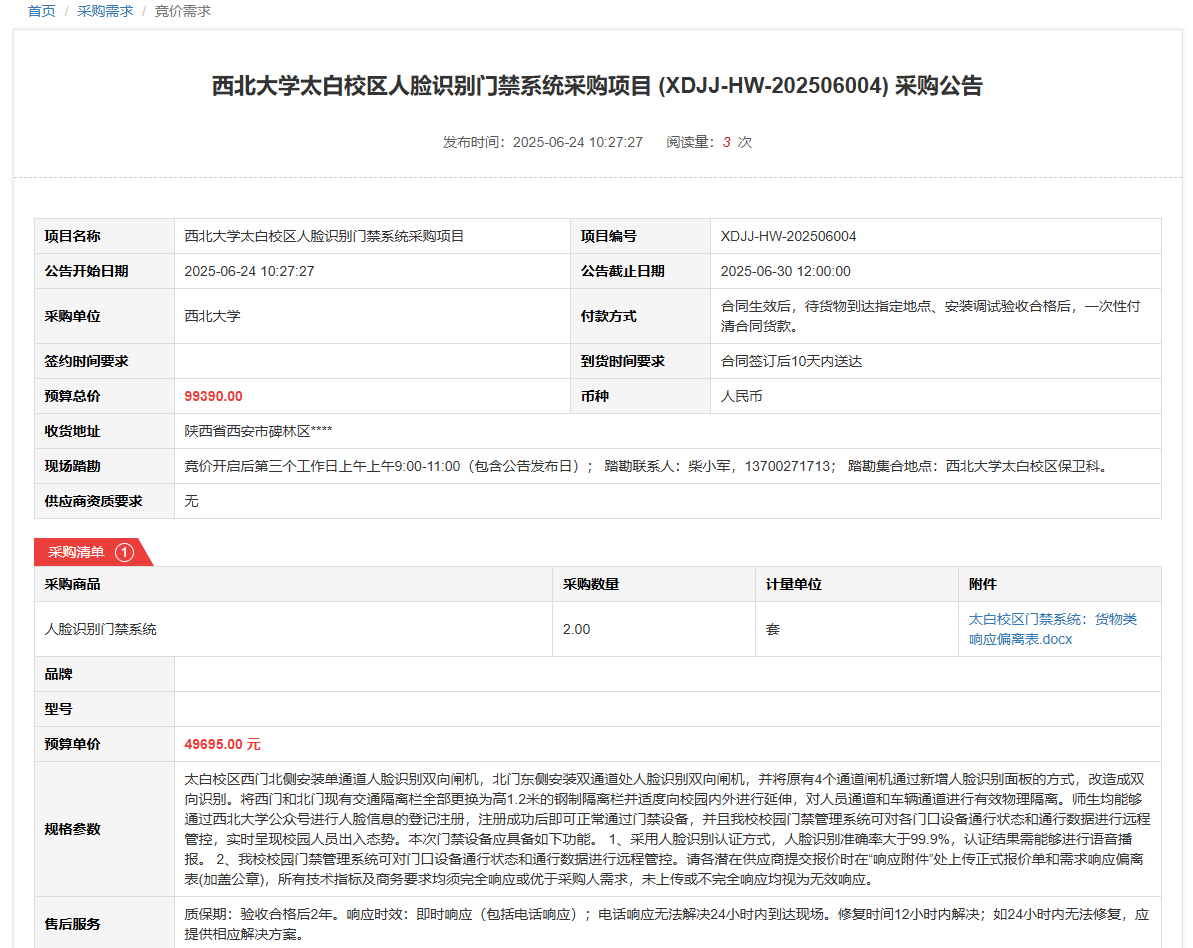 欧冠官方网站太白校区人脸识别门禁系统采购项目(XDJJ-HW-202506004)竞价采购公告 作者: 编辑: 时间:2025-06-24 原公告链接:https://www.ejingcai.com.cn/site/bidding/detail/19128