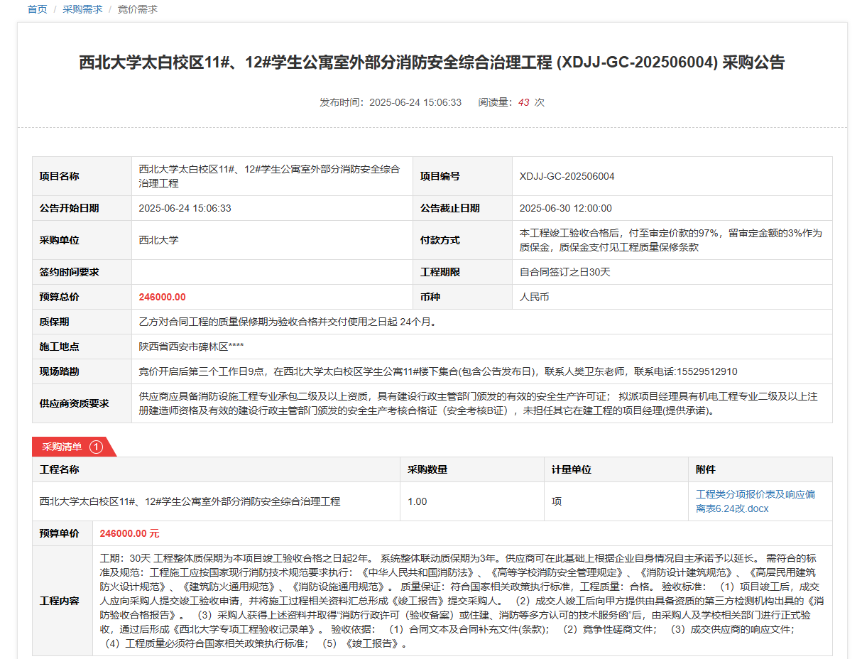 欧冠官方网站太白校区11#、12#学生公寓室外部分消防安全综合治理工程(XDJJ-GC-202506004)竞价采购公告 作者:采购与招标办公室 编辑: 时间:2025-06-25 原公告链接:https://www.ejingcai.com.cn/site/bidding/detail/19136