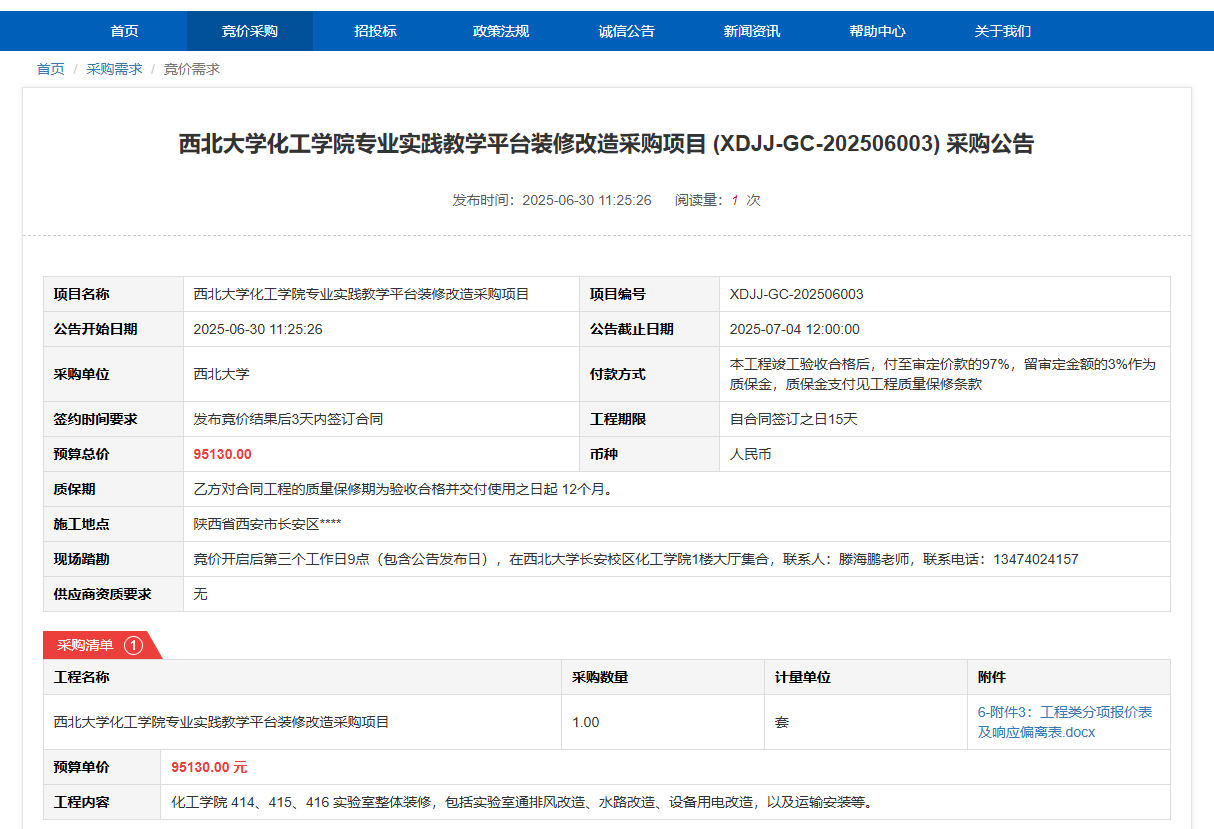 欧冠官方网站化工学院专业实践教学平台装修改造采购项目(XDJJ-GC-202506003)竞价采购公告 作者:采购与招标办公室 编辑: 时间:2025-06-30 原公告链接:https://www.ejingcai.com.cn/site/bidding/detail/19244