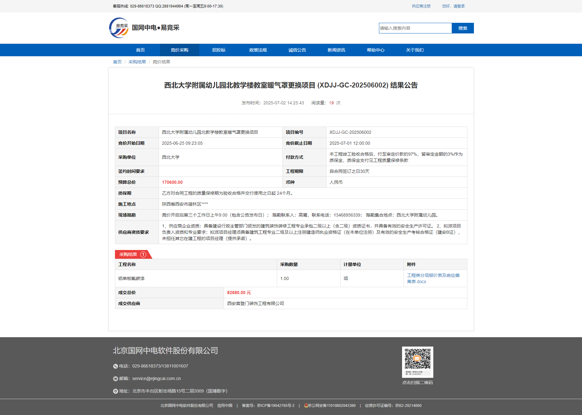 欧冠官方网站附属幼儿园北教学楼教室暖气罩更换项目 (XDJJ-GC-202506002) 结果公告
