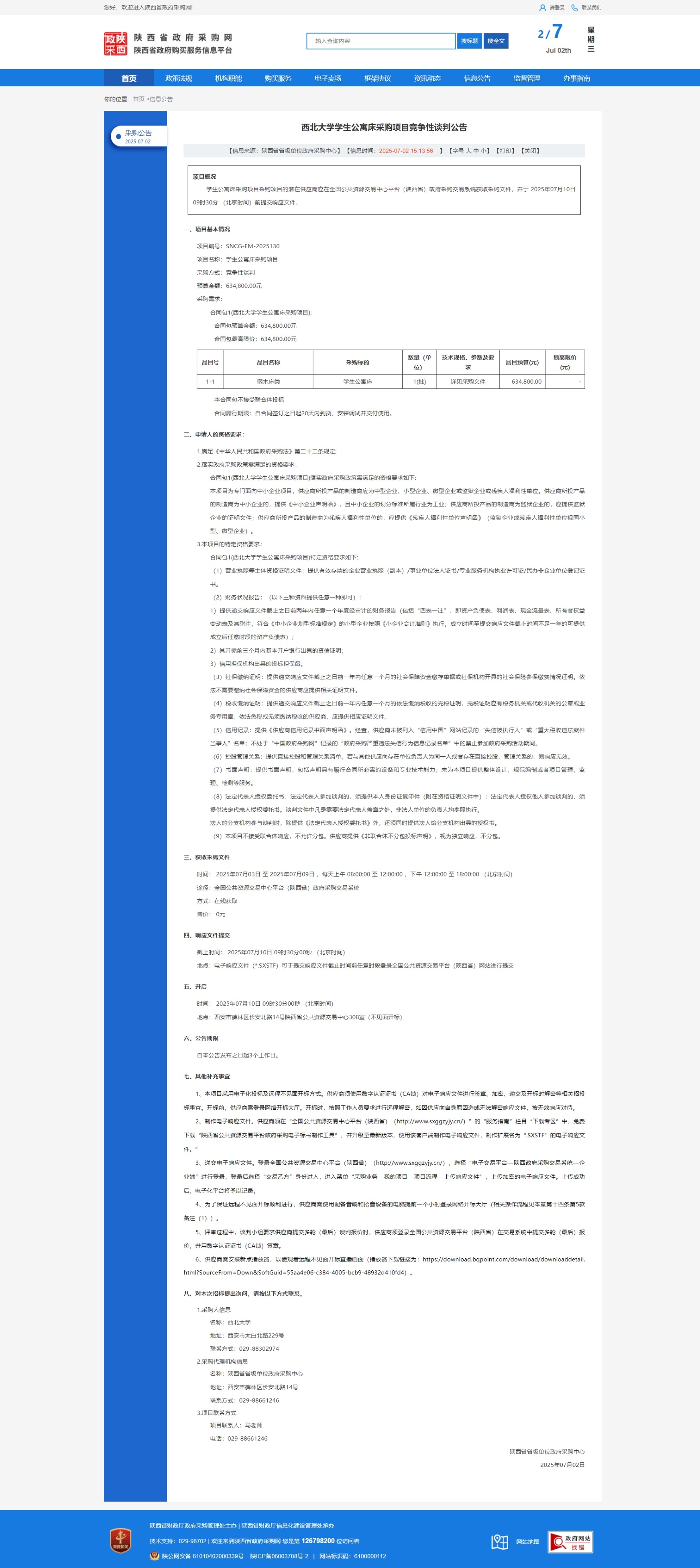欧冠官方网站学生公寓床采购项目竞争性谈判公告 作者: 编辑:采购与招标办公室 时间:2025-07-02 原公告链接:https://www.ccgp-shaanxi.gov.cn/freecms/site/shaanxi/ggxx/info/2025/8a69c67497a9ff030197c8e900a9510c.html?noticeType=001013¬iceId=1bd2af55-5716-11f0-8063-08c0eb20c666