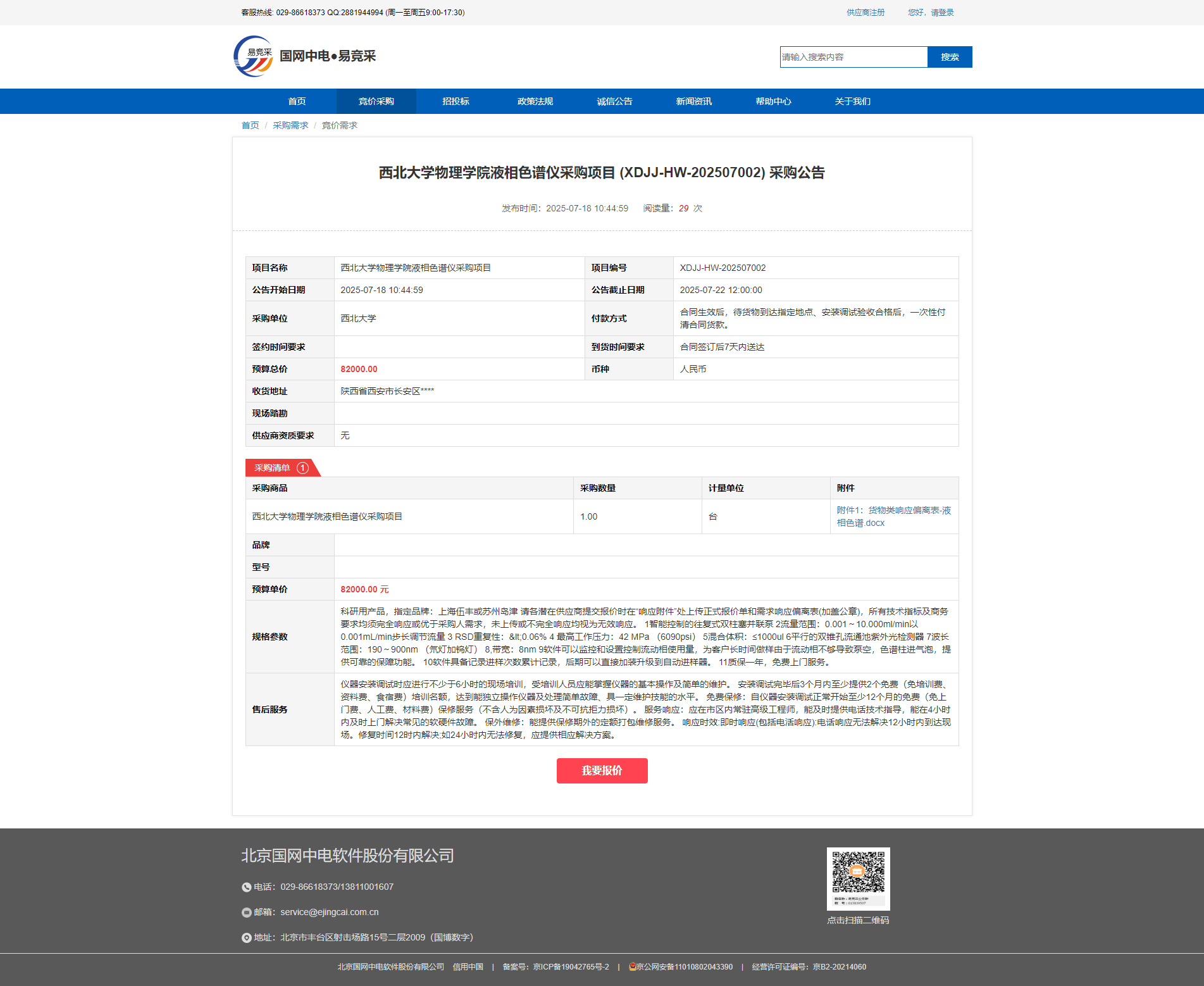 欧冠官方网站物理学院液相色谱仪采购项目 (XDJJ-HW-202507002) 采购公告