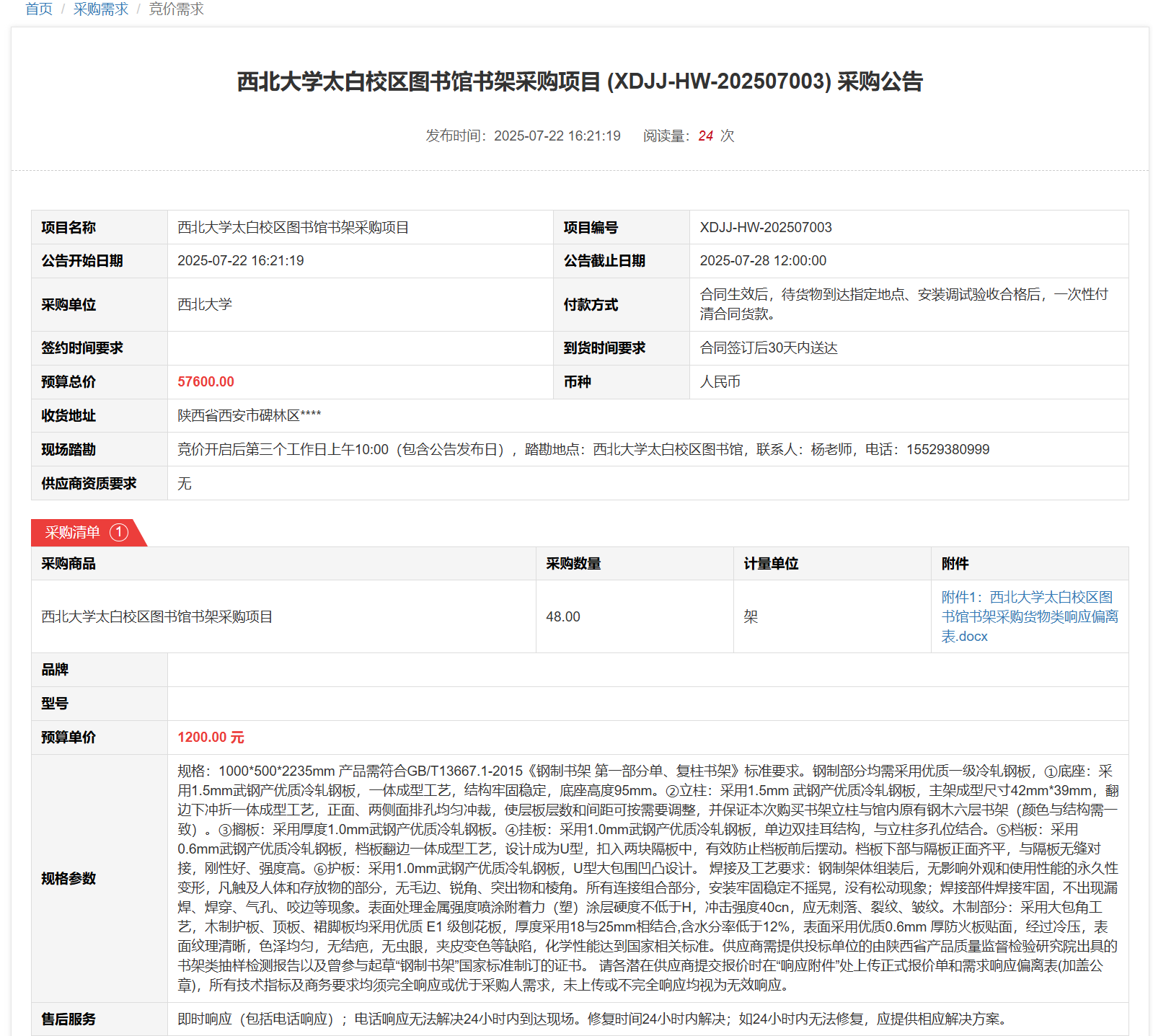 欧冠官方网站太白校区图书馆书架采购项目(XDJJ-HW-202507003)竞价采购公告 作者:采购与招标办公室 编辑: 时间:2025-07-22 原公告链接:https://www.ejingcai.com.cn/site/bidding/detail/19666