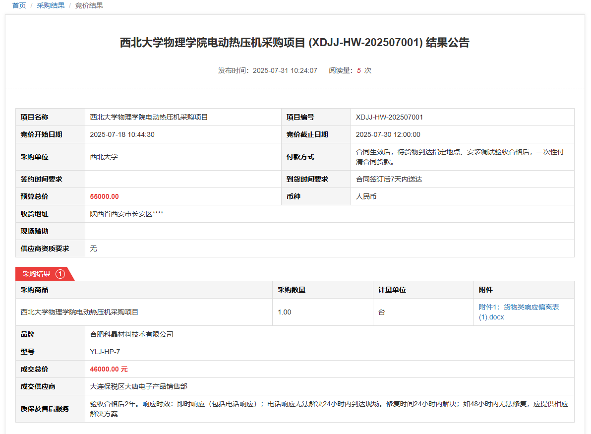 欧冠官方网站物理学院液相色谱仪采购项目(XDJJ-HW-202507002)竞价结果公告