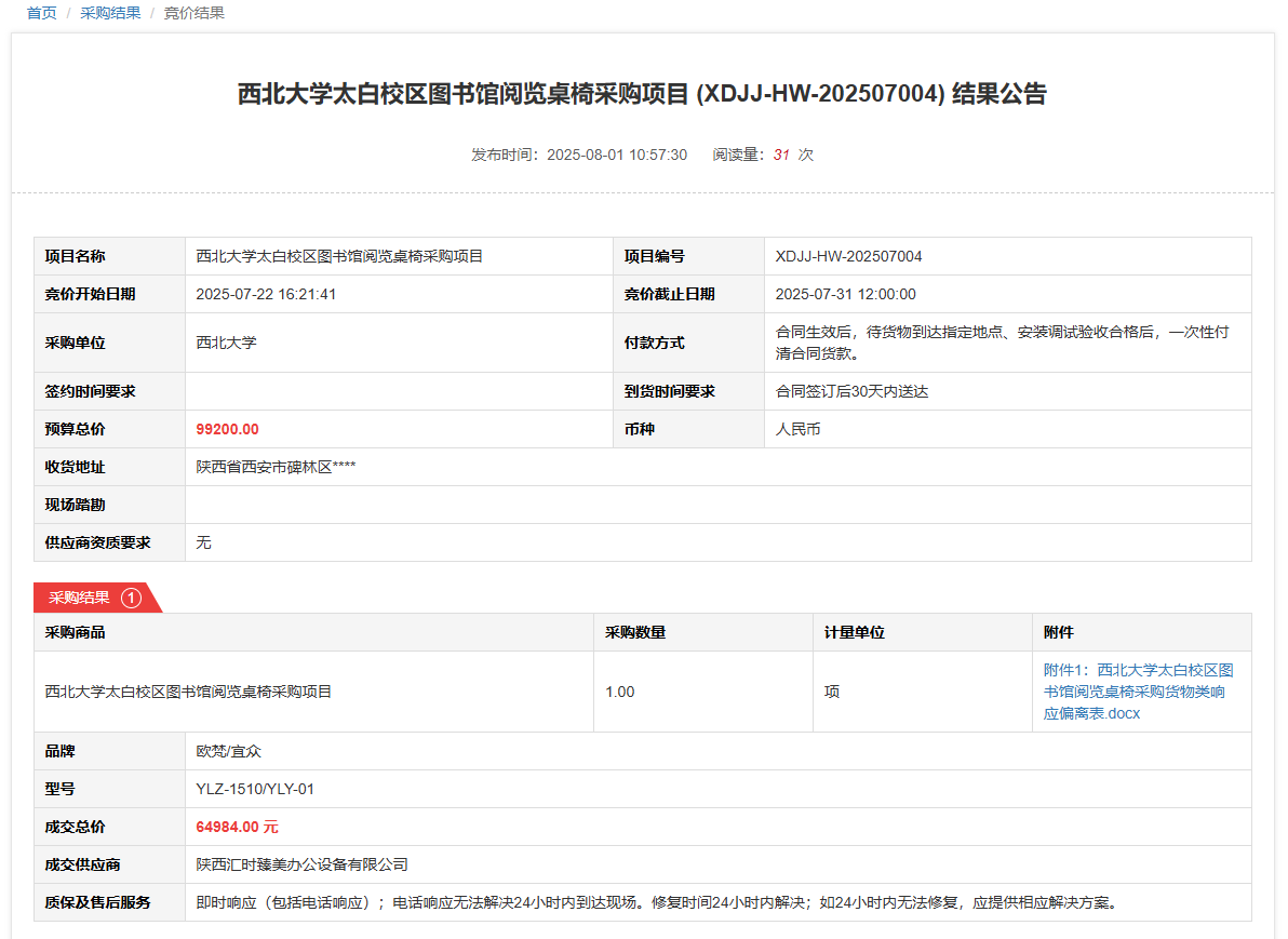 欧冠官方网站太白校区图书馆阅览桌椅采购项目(XDJJ-HW-202507004)竞价结果公告