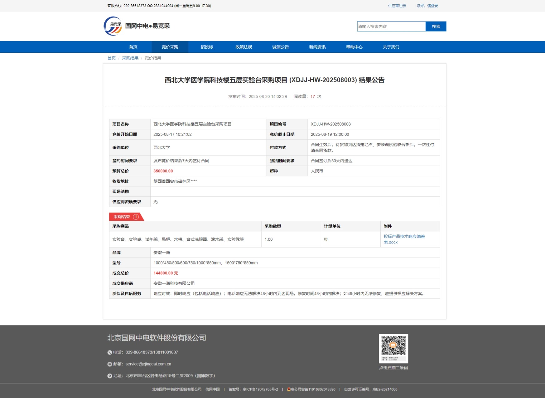 欧冠官方网站医学院科技楼五层实验台采购项目 (XDJJ-HW-202508003) 结果公告 作者: 编辑:采购与招标办公室 时间:2025-08-20 原公告链接:https://www.ejingcai.com.cn/site/bidding/detail/20040