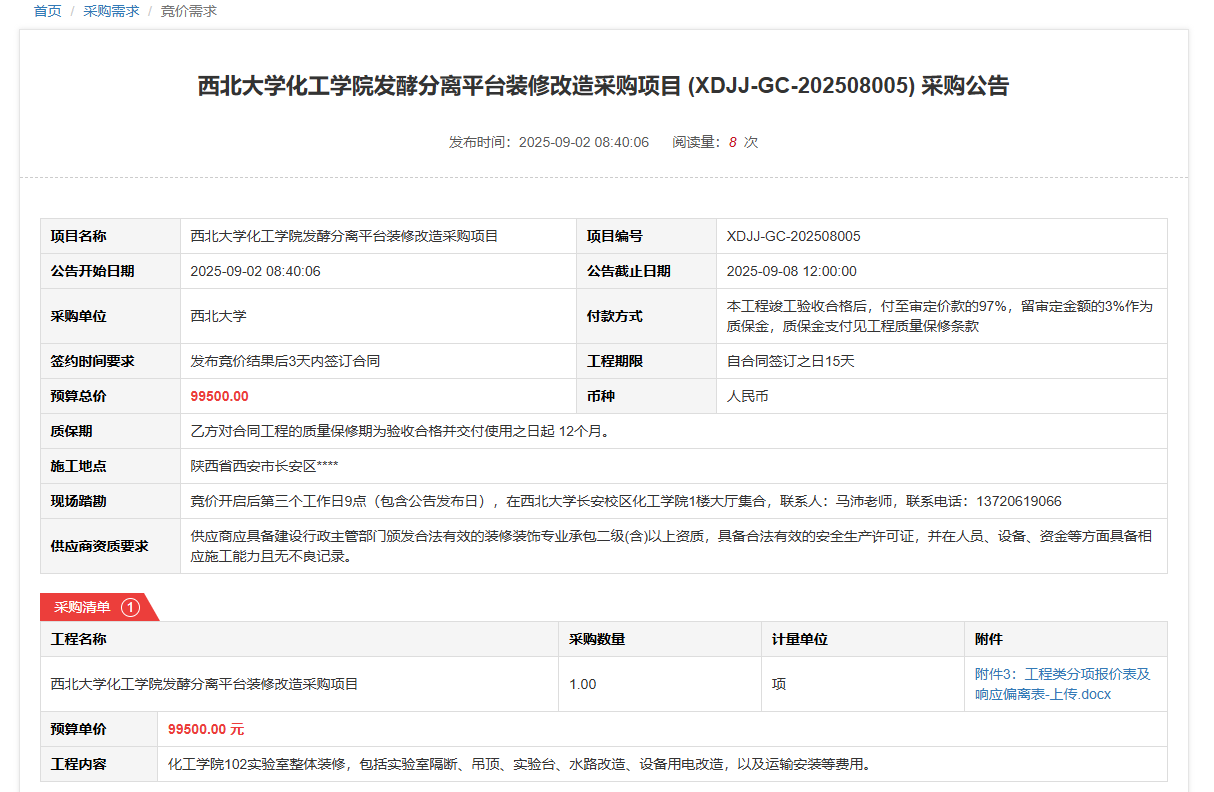 欧冠官方网站化工学院发酵分离平台装修改造采购项目(XDJJ-GC-202508005)竞价采购公告