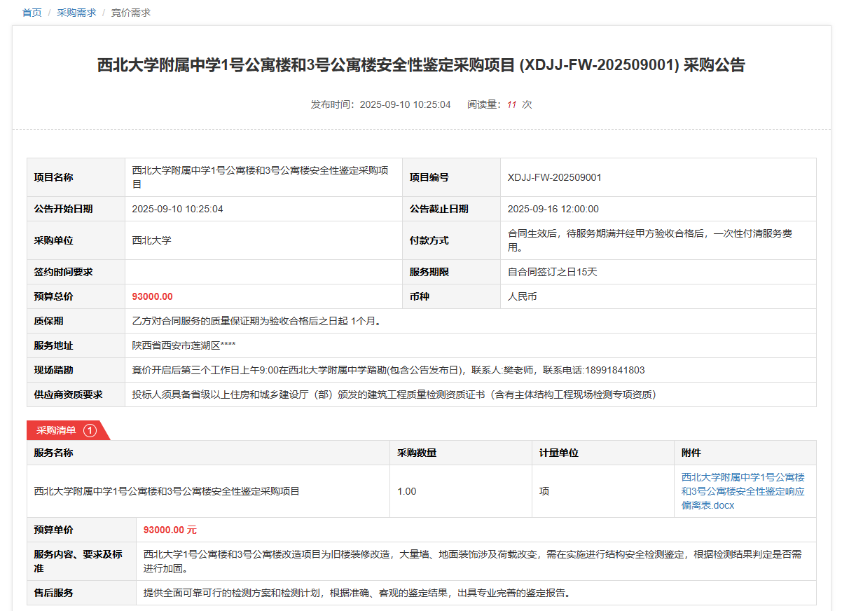 欧冠官方网站附属中学1号公寓楼和3号公寓楼安全性鉴定采购项目(XDJJ-FW-202509001)竞价采购公告