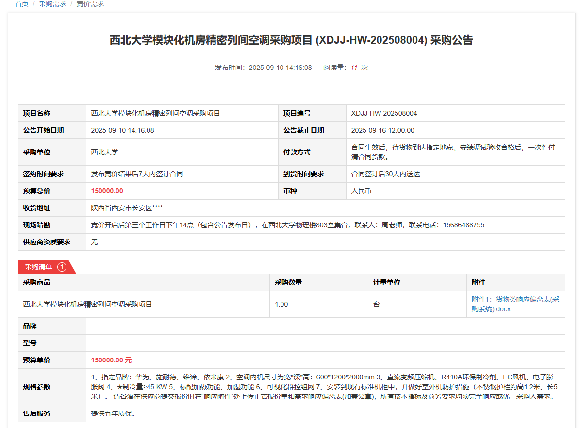欧冠官方网站模块化机房精密列间空调采购项目(XDJJ-HW-202508004)竞价采购公告