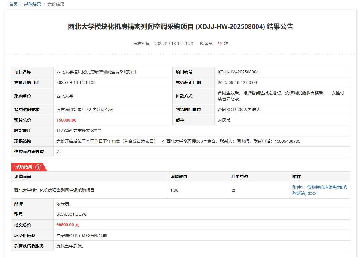 欧冠官方网站模块化机房精密列间空调采购项目(XDJJ-HW-202508004)竞价结果公告