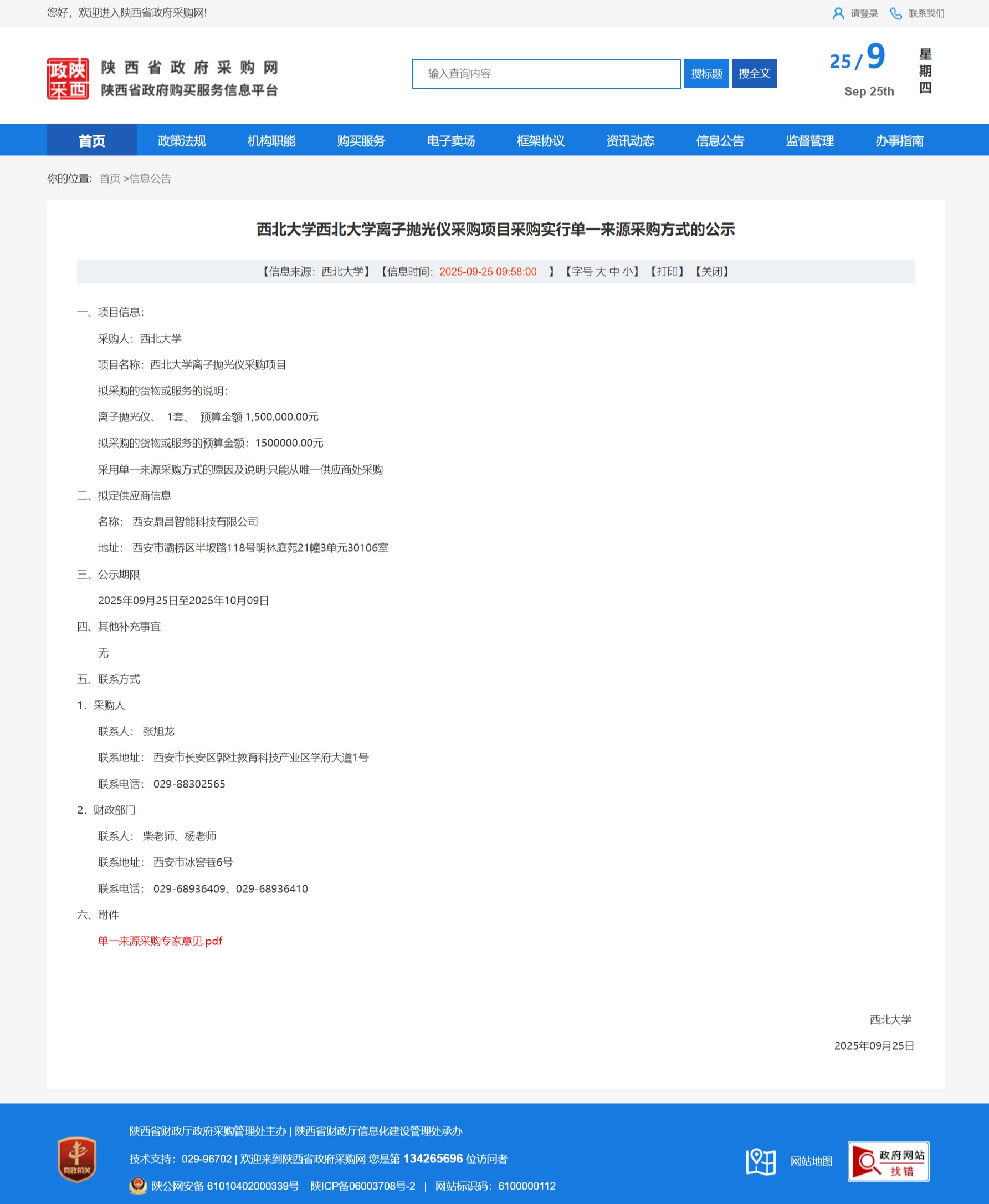 欧冠官方网站离子抛光仪采购项目实行单一来源采购方式的公示