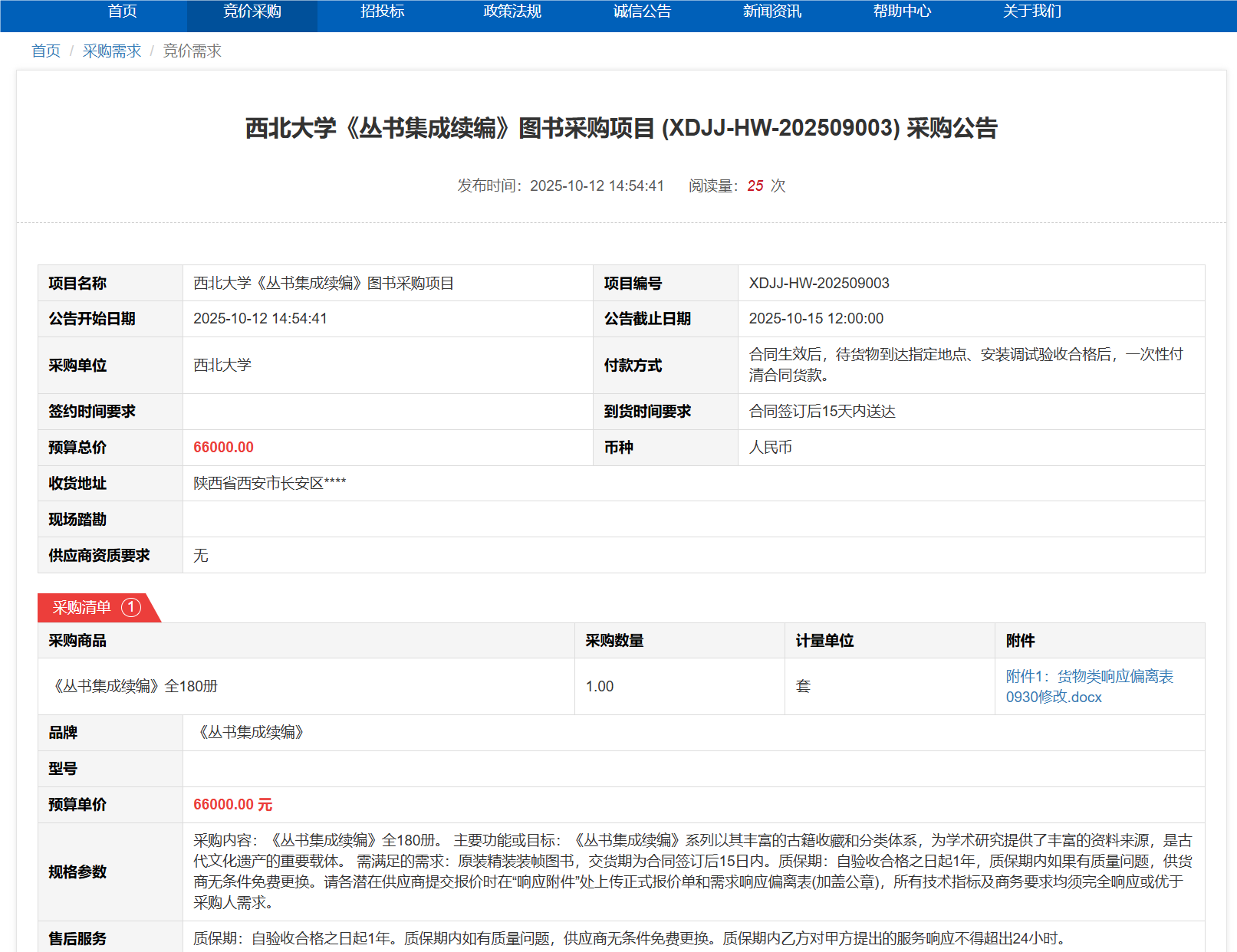 欧冠官方网站《丛书集成续编》图书采购项目(XDJJ-HW-202509003)竞价采购公告