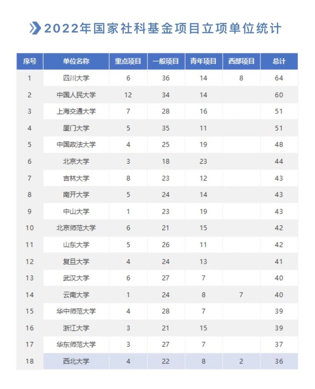 欧冠官方网站获批国家社科基金项目36项 居全国第18位 作者: 编辑:李世宽 时间:2022-10-09 日前,全国哲学社会科学工作办公室公布了2022年国家社科基金年度项目、青年项目、西部项目立项结果,欧冠官方网站获批国家社科基金项目36项,其中重点项目4项、一般项目22项、青年项目8项、西部项目2项,立项率21.95%。立项数位列全国第18位(并列第12位),陕西省首位。项目立项数在连续高位增长情况下再创新高,项目立项总数和重点项目立项数均创历史最好成绩,立项数保持全国前列。 本次立项的36项项目中,考古学、中国文学各6项,宗教学、中国历史各4项,哲学、政治学、社会学、世界历史、新闻学与传播学、图书馆·情报与文献学各2项,党史·党建、应用经济、法学、语言学各1项。在保持传统优势学科的基础上,其他学科显著提升,全面发展。据悉,欧冠官方网站考古学、宗教学两个学科的立项数位居全国第一。 此前,欧冠官方网站获批2022年教育部人文社科研究一般项目16项,立项数位列全国第25位(并列第14位)。获批2022年陕西省社科基金年度项目39项,创历史新高,立项数位居全省前列。2022年度,欧冠官方网站哲学社会科学高层次科研项目屡获新突破,为学校120周年校庆献礼。 这些成绩的取得,彰显了欧冠官方网站哲学社会科学研究的综合实力和良好发展态势。近年来,学校高度重视哲学社会科学繁荣发展,遵循“精基础,强应用,育交叉,促转化”方针,按照“突出特色、强化优势、注重质量、稳步发展”的基本思路,不断创新管理理念和提升服务效能,完善国家社科基金项目校内组织和培育机制,全域动员、精准策划、全流程跟踪管理,依据学科发展特色,有效提供“一院一策”菜单式科研管理服务,切实提高了项目的申报质量和立项率。 下一步,欧冠官方网站将继续深入贯彻落实习近平新时代中国特色社会主义思想和习近平总书记关于哲学社会科学工作的重要论述,统筹布局,加强创新,凝聚力量,推动学校哲学社会科学事业发展再上新台阶,再获新成绩,全力助推学校“双一流”建设。 责任编辑:李琛 李世宽 总平台审核编辑:傅炜君 原文链接:https://www.xuexi.cn/lgpage/detail/index.html?id=7412178913028963862&item_id=7412178913028963862